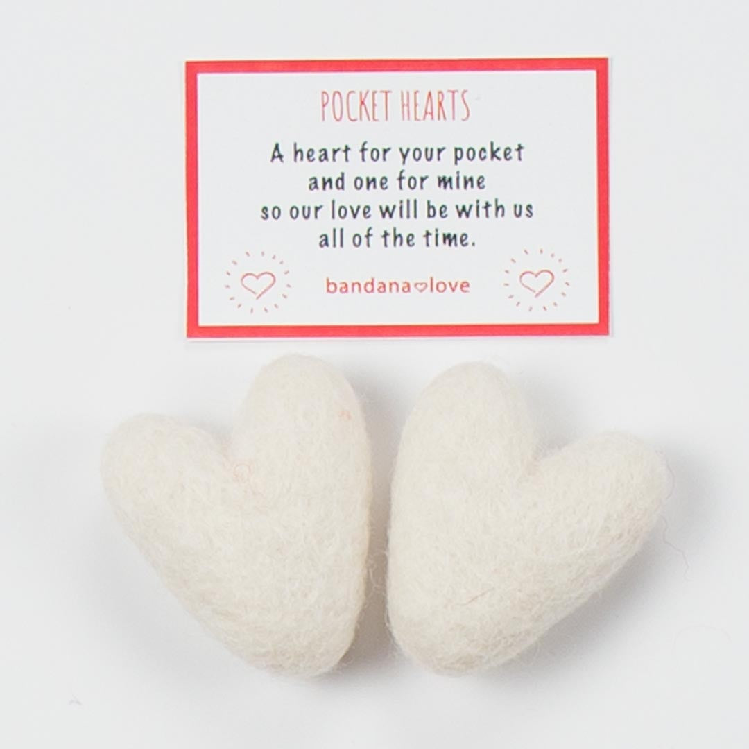 A set of two handmade 2 inch ivory wool felted hearts for the pocket. Give them as a gift for yourself and a loved one, so your love will be with you even when you are apart. Packaged together in a small case with the message, “A heart for your pocket and one for mine, so our love will be with us all of the time.”