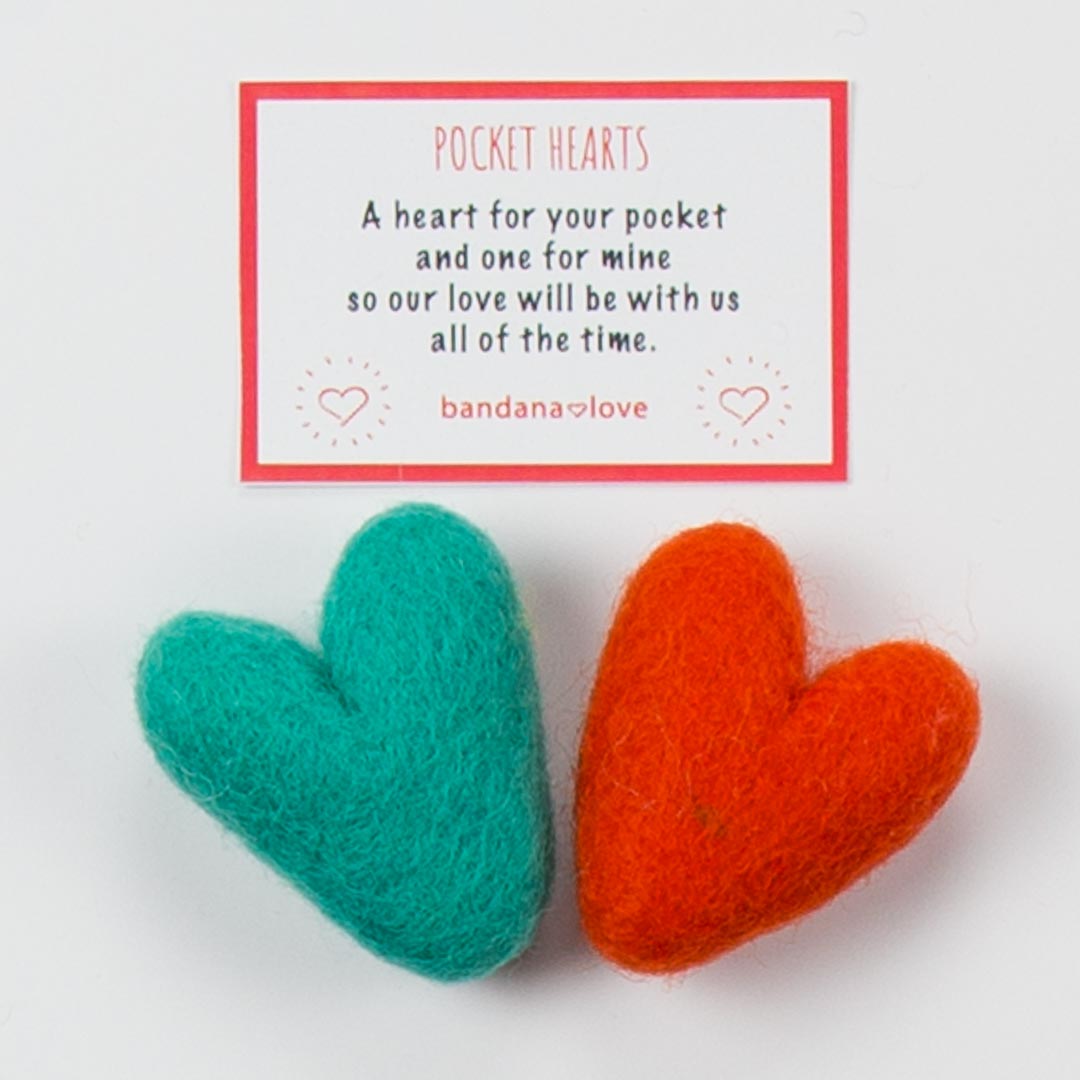 A set of two handmade 2 inch orange and mint wool felted hearts for the pocket. Give them as a gift for yourself and a loved one, so your love will be with you even when you are apart. Packaged together in a small case with the message, “A heart for your pocket and one for mine, so our love will be with us all of the time.”