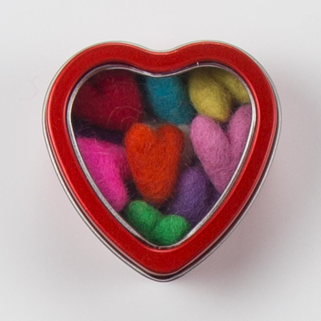 One dozen handmade 3/4" wool felted hearts in a multicolor mix. Packaged in a red heart tin.