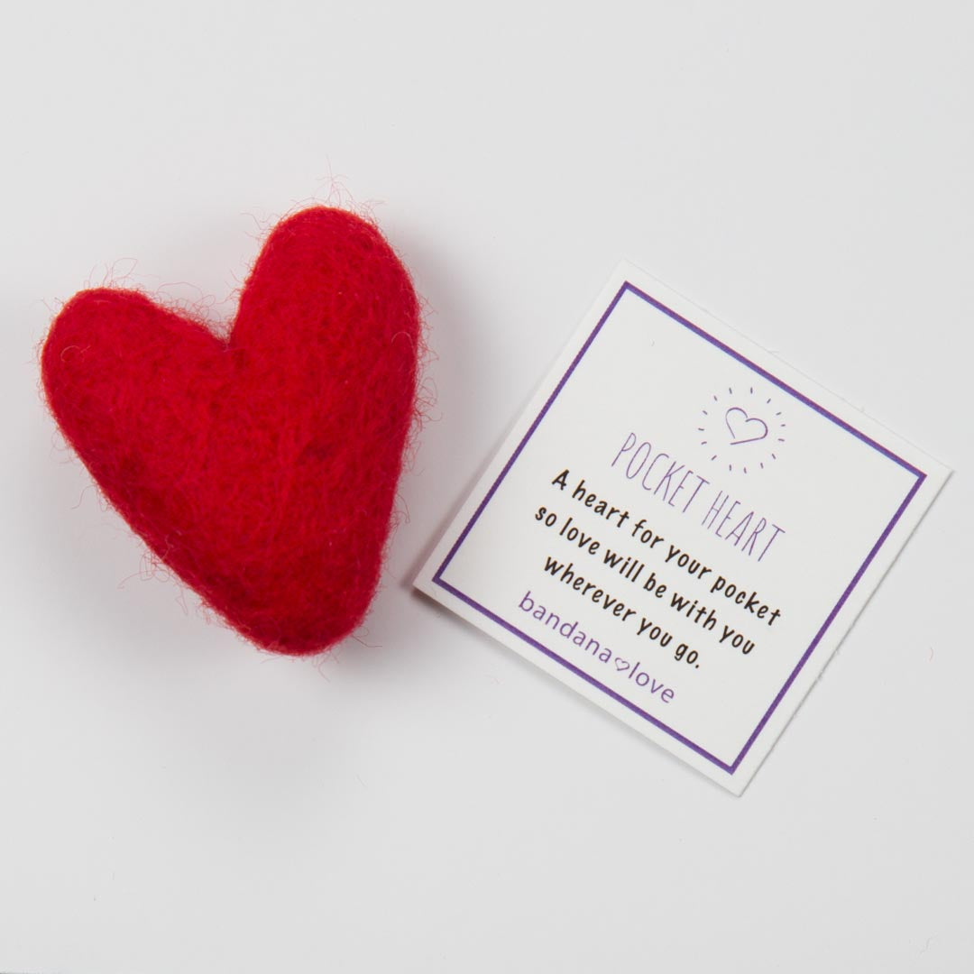 A handmade 2 inch red wool felted heart for the pocket. Give them as a gift to show someone they are loved. Packaged in a small case with the message, “A heart for your pocket, so love will be with you wherever you go”.