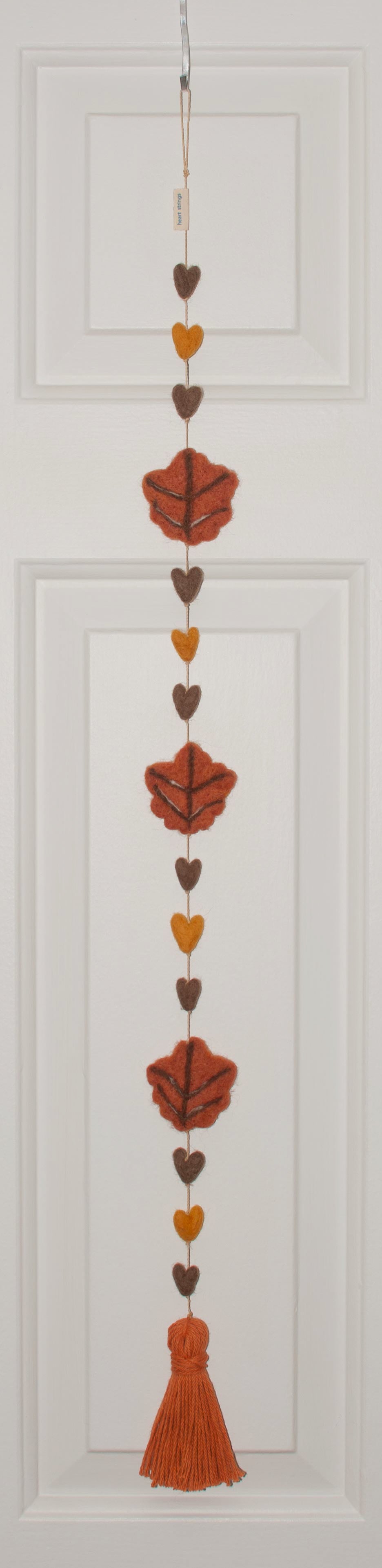 Our hand made wool felted “Autumn Leaves” Heart String is decorated with our brown and golden yellow felted hearts, and burnt orange and brown felted leaves, and a burnt orange tassel. Approximately 32 inches long. Packaged in an orange bandana cloth bag.