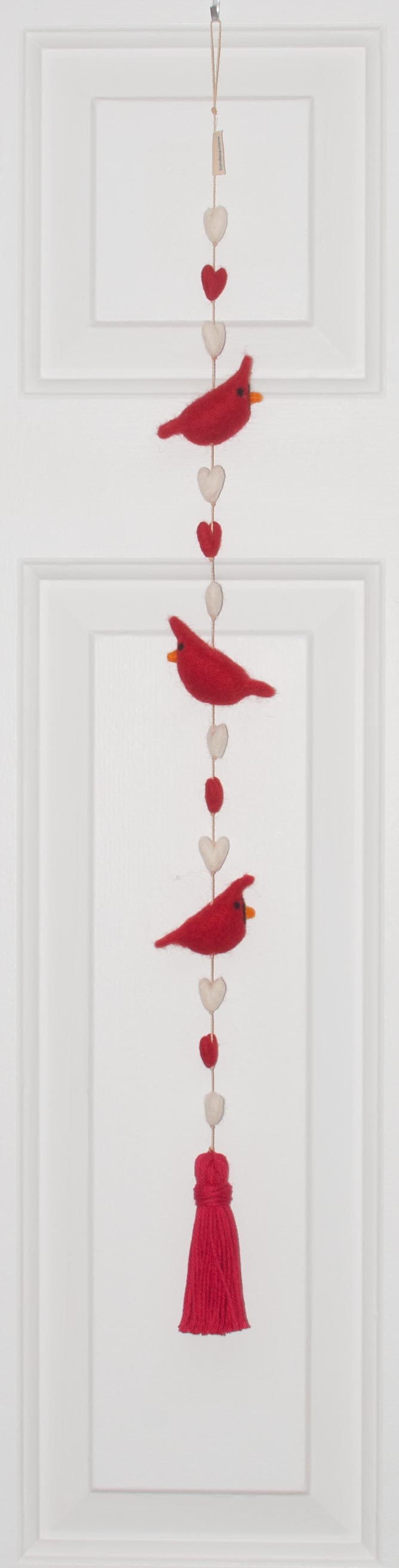 Our hand made wool felted “Cardinals” Heart String is decorated with our red and ivory felted hearts, and red felted cardinals, and a red tassel. Approximately 32 inches long. Packaged in a red bandana cloth bag.