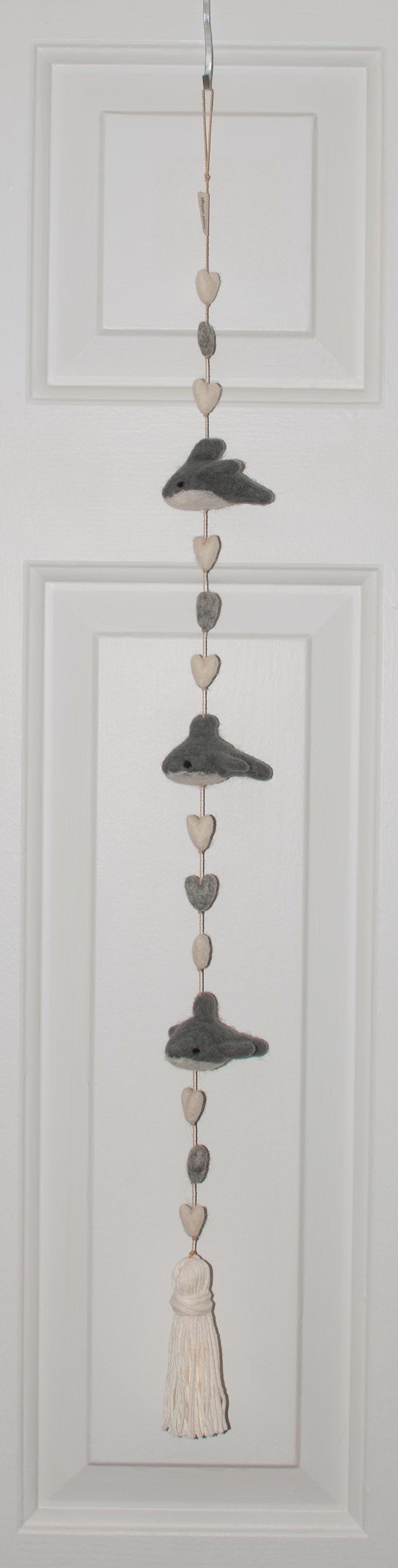 Our hand made wool felted “Dolphins” Heart String is decorated with our ivory and grey felted hearts, and ivory and grey felted dolphins, and an ivory tassel. Approximately 32 inches long. Packaged in an ivory bandana cloth bag.