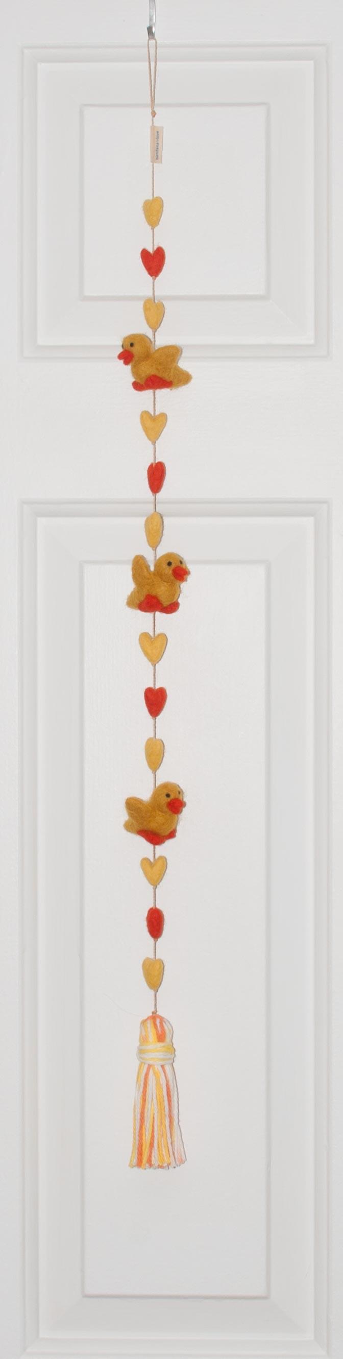 Our hand made wool felted “Ducks” Heart String is decorated with our yellow and ivory felted hearts, and yellow and orange felted ducks, and a yellow, orange, and ivory tassel. Approximately 32 inches long. Packaged in a yellow bandana cloth bag.