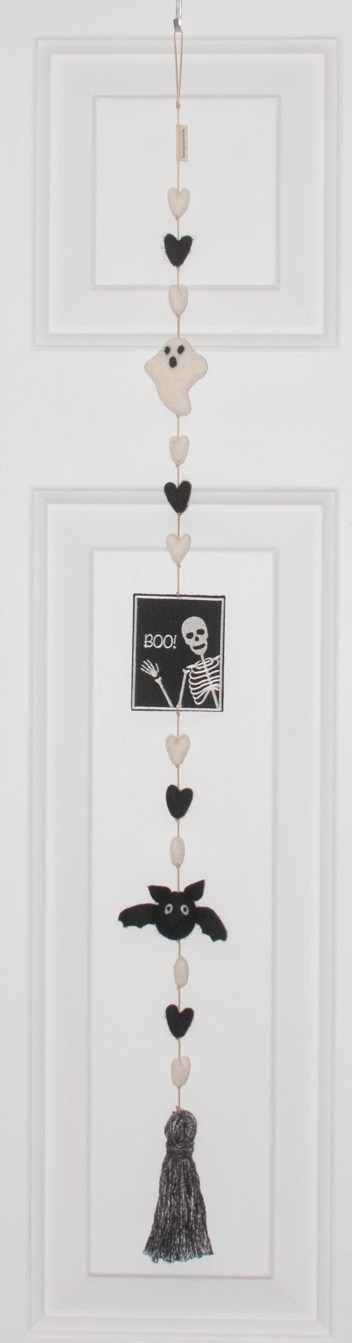Our hand made wool felted “Boo” Heart String is made with our ivory wool felted hearts and an ivory felted ghost and black bat. Decorated with an embroidered felt "Boo”patch at the center and finished with a black and ivory tassel at the end. Approximately 34 inches long. Packaged in a black and ivory bandana cloth bag.