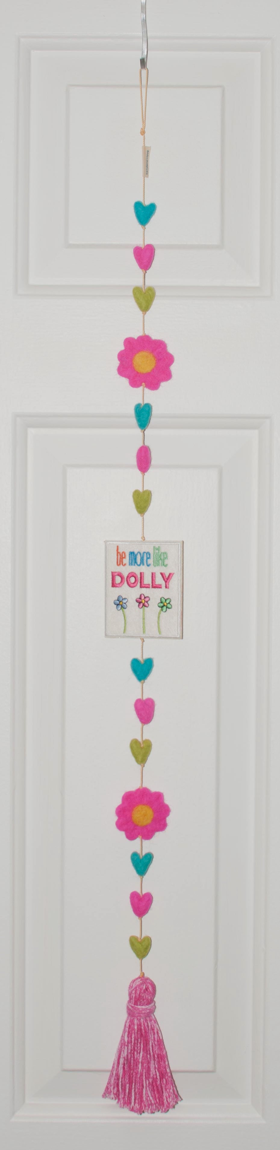 Our hand made wool felted “Hello Dolly” Heart String is made with our turquoise, pink, and green wool felted hearts and two pink and yellow felted daisies. Decorated with an embroidered felt "Hello Dolly” patch at the center and finished with a pink and ivory tassel at the end. Approximately 34 inches long. Packaged in a pink bandana cloth bag.