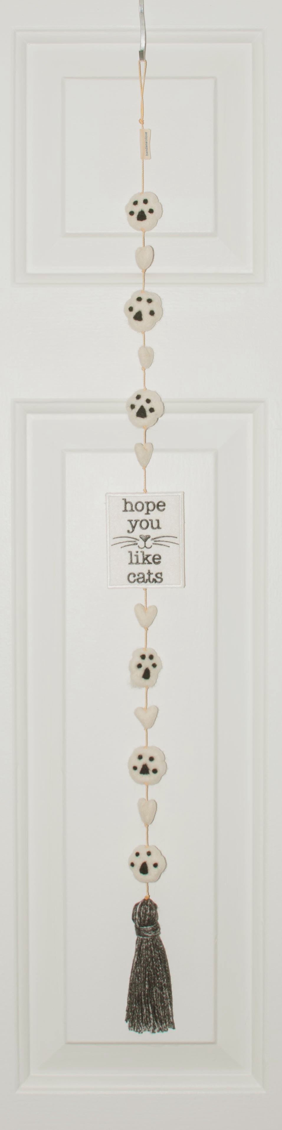 Our hand made wool felted “Hope You Like Cats” Heart String is made with our wool felted ivory hearts and wool felted paw prints. Decorated with an embroidered felt "Hope You Like Cats” patch at the center and finished with a black and ivory tassel at the end. Approximately 32 inches long. Packaged in a black and white bandana cloth bag.