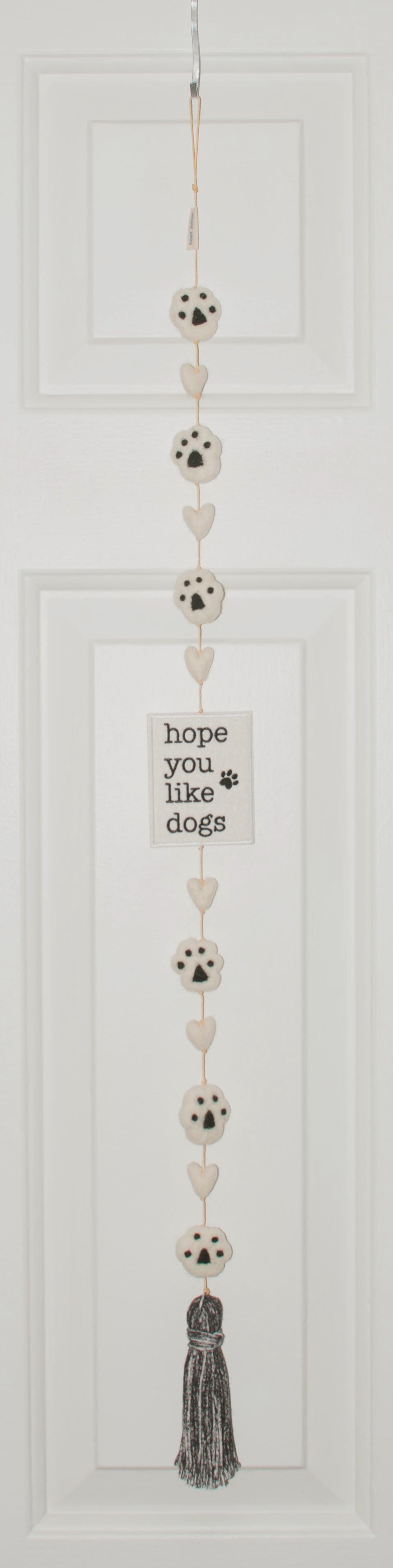 Our hand made wool felted “Hope You Like Dogs” Heart String is made with our wool felted ivory hearts and wool felted paw prints. Decorated with an embroidered felt "Hope You Like Dogs” patch at the center and finished with a black and ivory tassel at the end. Approximately 32 inches long. Packaged in a black and white bandana cloth bag.