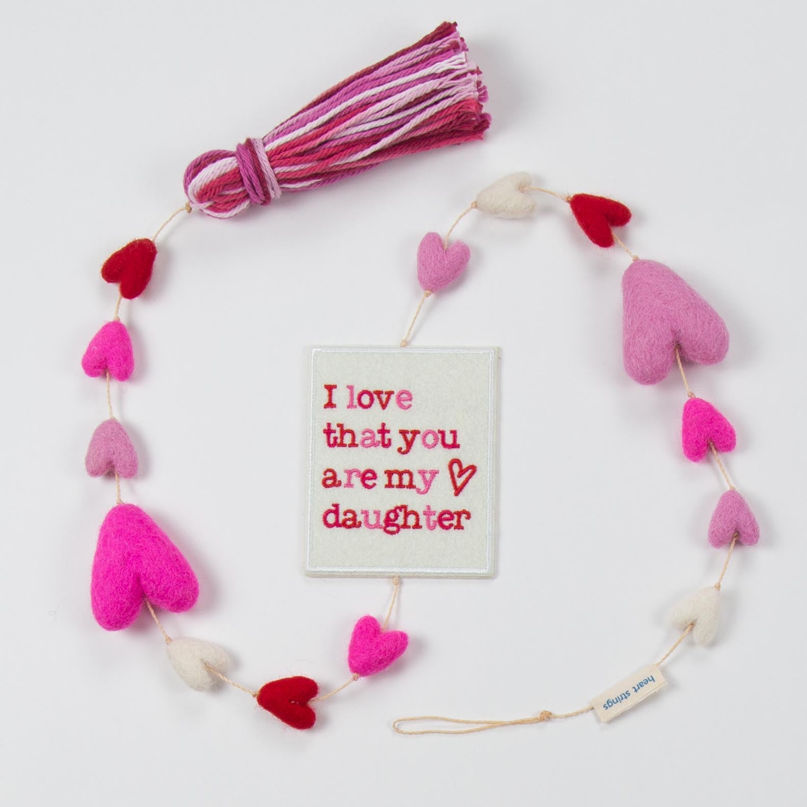 Our hand made wool felted “I Love That You are My Daughter” Heart String is made with our ivory, pink, and red wool felted hearts and two large pink felted hearts. Decorated with an embroidered felt "I Love that You are My Daughter” patch at the center and finished with a pink and red tassel at the end. Approximately 33 inches long. Packaged in a pink bandana cloth bag.