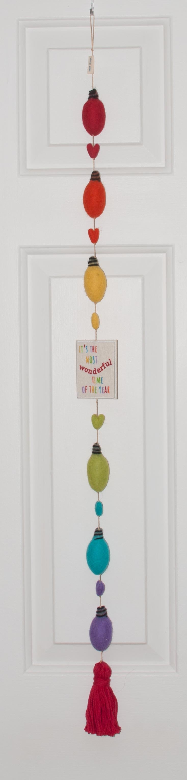 Our hand made wool felted “It’s the Most Wonderful Time of the Year” Heart String is made with our wool felted hearts and holiday lights in the color of the rainbow. Decorated with an embroidered felt "It’s the Most Wonderful Time of the Year” patch at the center and finished with a red tassel at the end. Approximately 40 inches long. Packaged in a red bandana cloth bag.