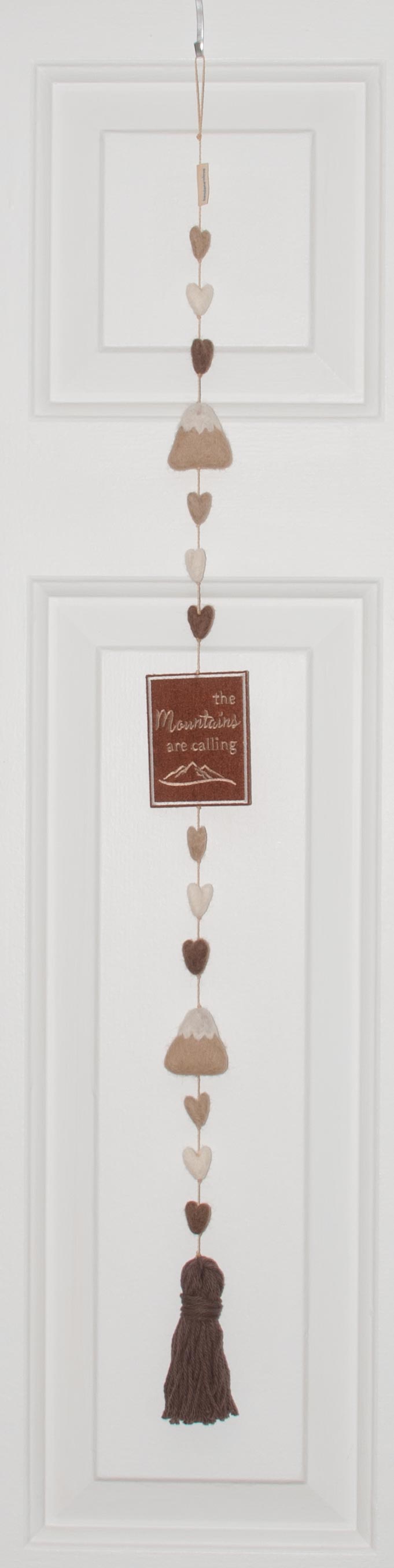 Our hand made wool felted “The Mountains are Calling” Heart String is made with our wool felted hearts in shades of brown and ivory and two wool felted mountains. Decorated with an embroidered felt "The Mountains are Calling” patch at the center and finished with a brown tassel at the end. Approximately 34 inches long. Packaged in an ivory bandana cloth bag.