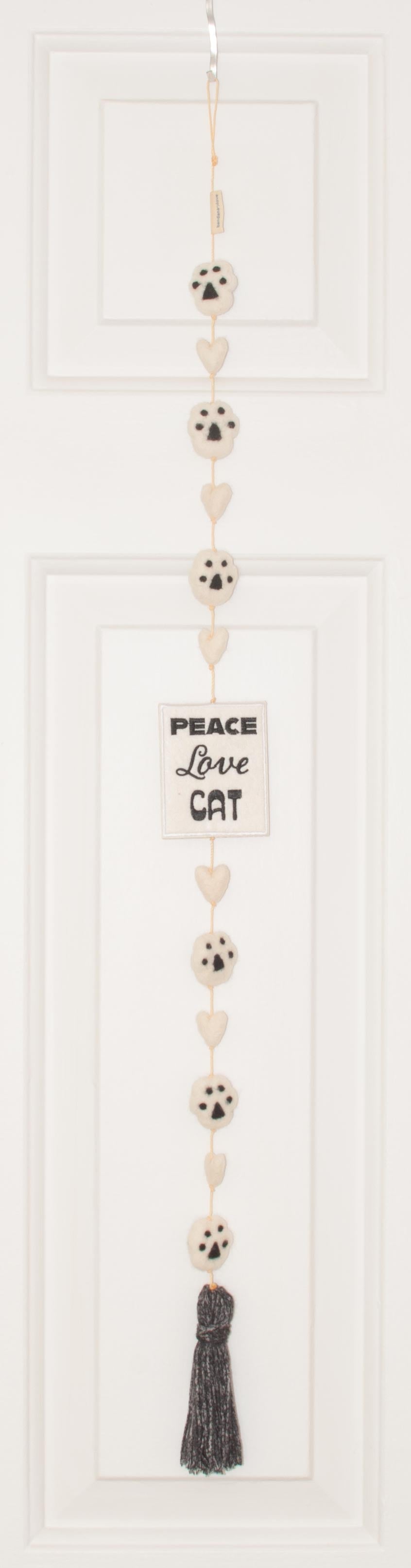 Our hand made wool felted “Peace Love Cat” Heart String is made with our ivory wool felted hearts and wool felted paw prints. Decorated with an embroidered felt "Peace Love Cat” patch at the center and finished with a black and ivory tassel at the end. Approximately 32 inches long. Packaged in a black and white bandana cloth bag.