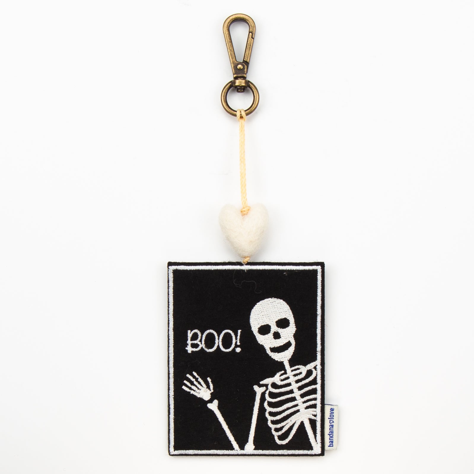 Our “Boo” Mini Heart String is handmade with a black felt patch embroidered in ivory with the message “Boo” and topped with an ivory felted wool heart.
