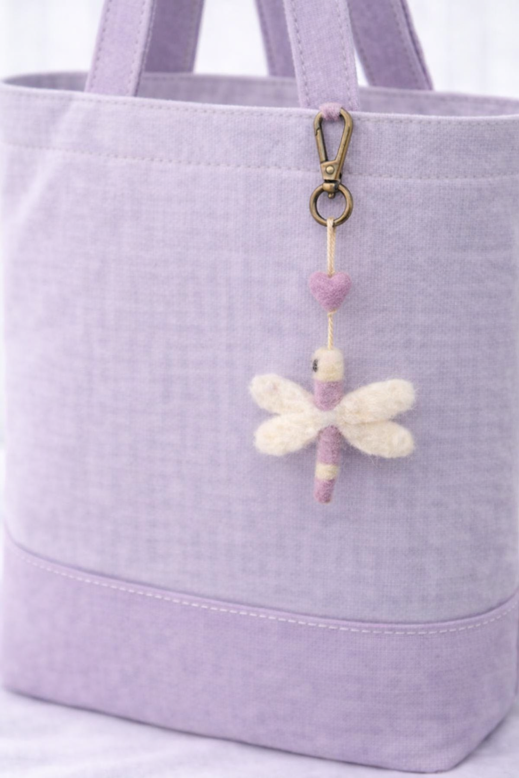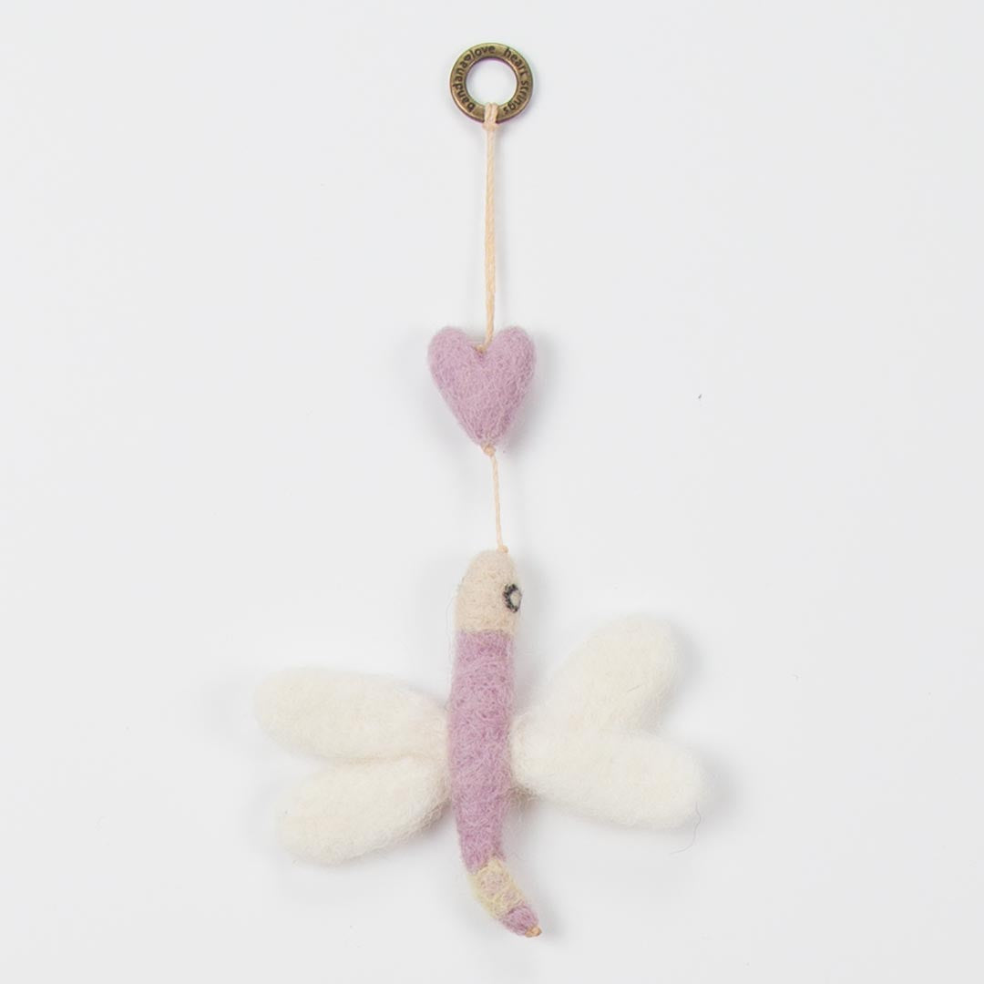 Our Dragonfly Mini Heart String is handmade from lavender and ivory felted wool topped with a lavender felted wool heart.
