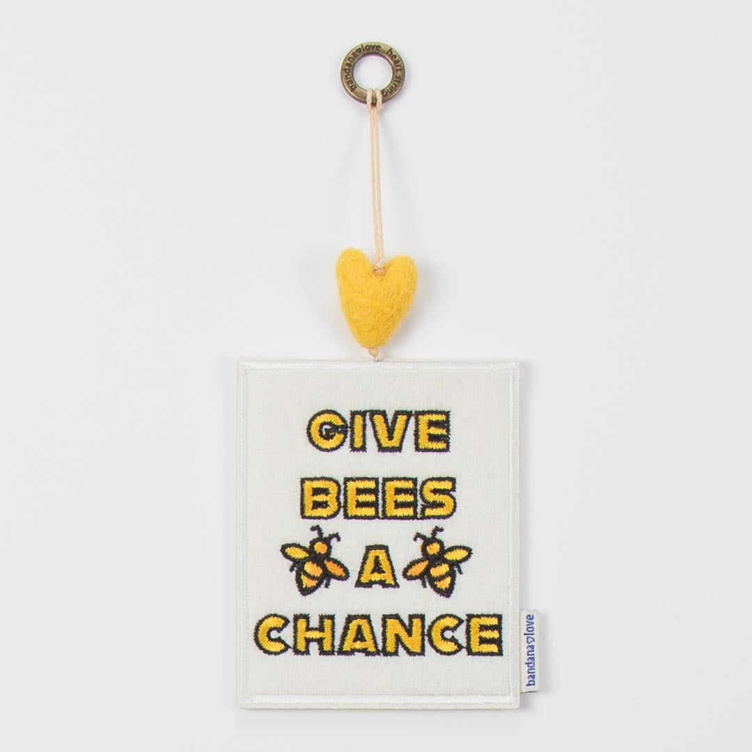 Our “Give Bees a Chance” Mini Heart String is handmade with an ivory felt patch embroidered in black and yellow with the message “Give Bees a Chance” and topped with a yellow felted wool heart.
