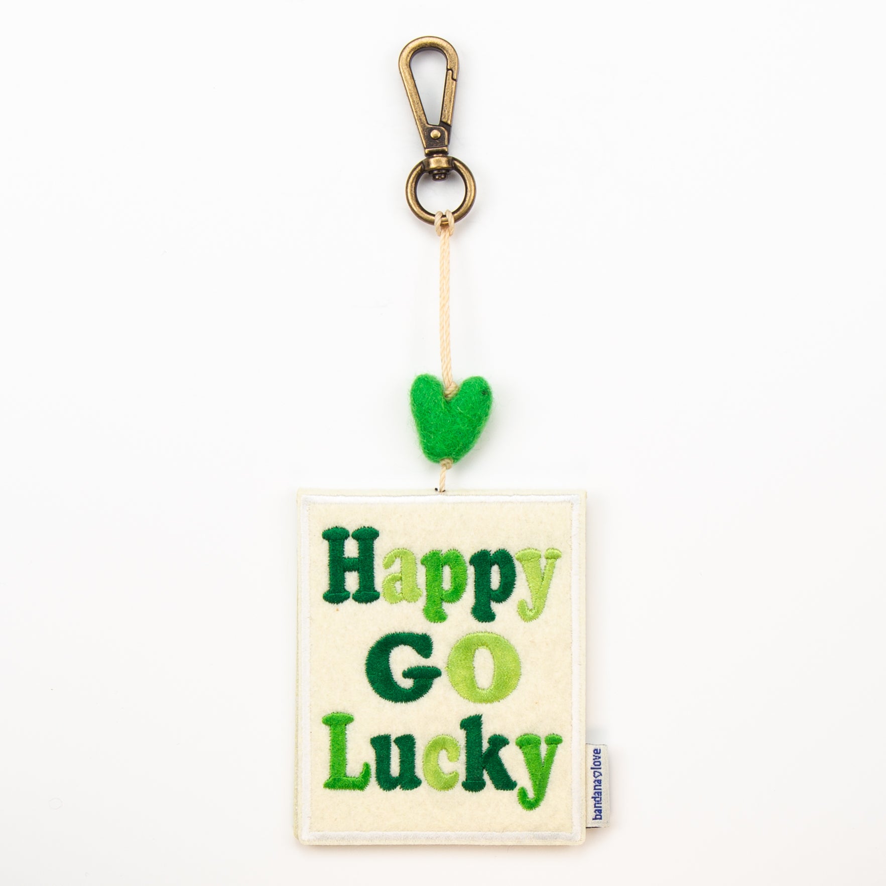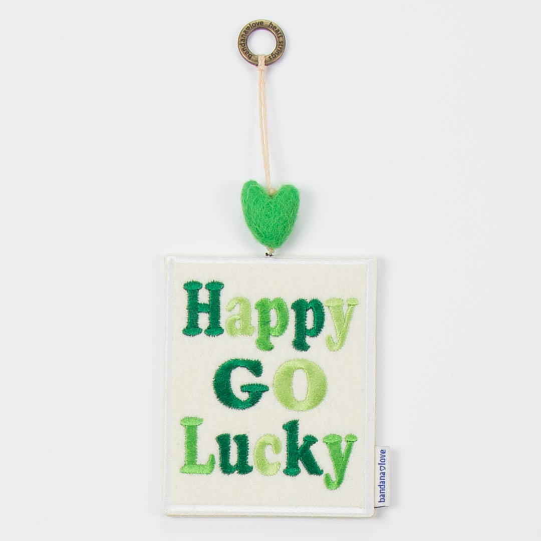 Our “Happy Go Lucky” Mini Heart String is handmade with an ivory felt patch embroidered in shades of green with the message “Happy Go Lucky” and topped with a green felted wool heart.