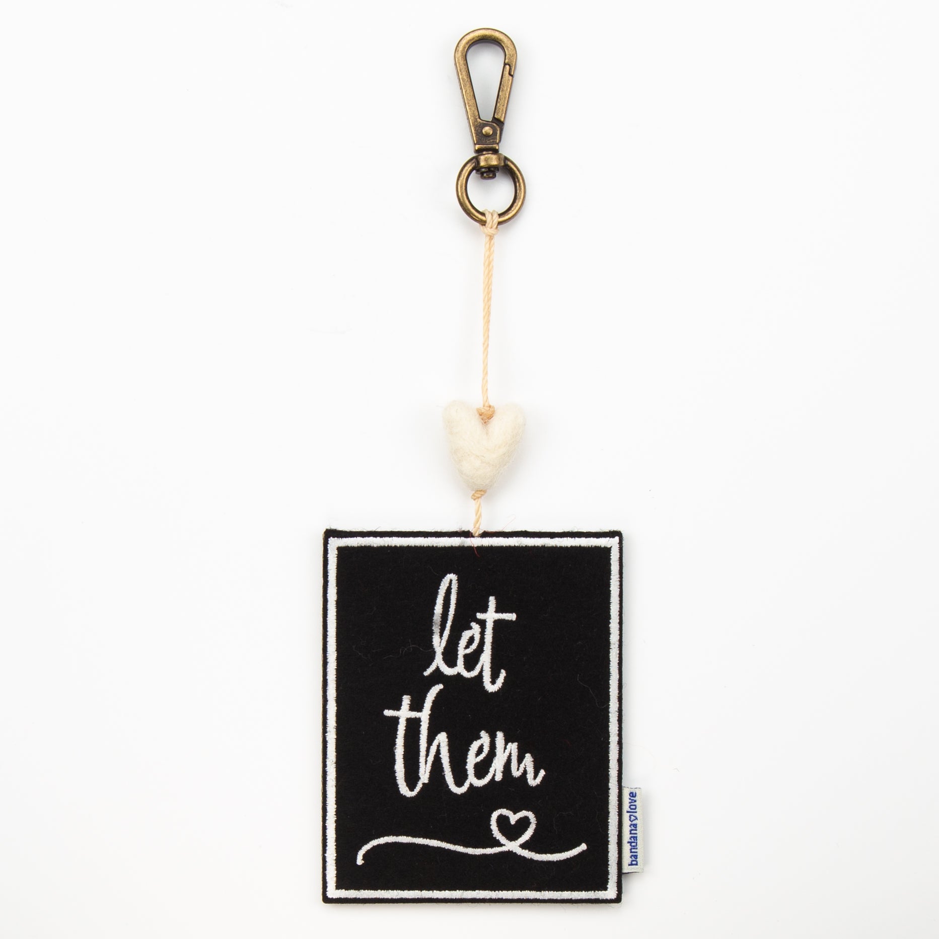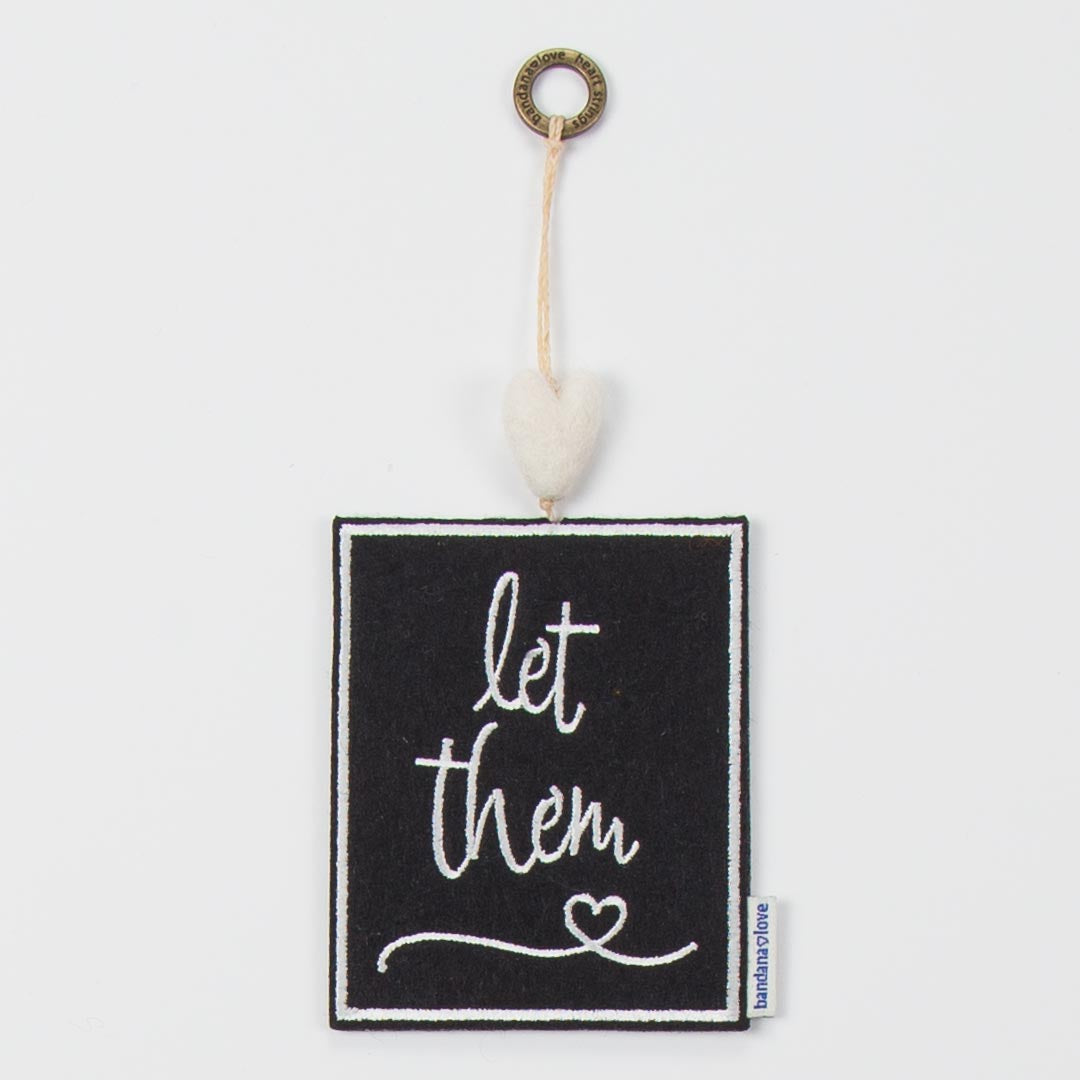 Our “Let Them” Mini Heart String is handmade with a black felt patch embroidered in ivory with the message “Let Them” and topped with an ivory felted wool heart.
