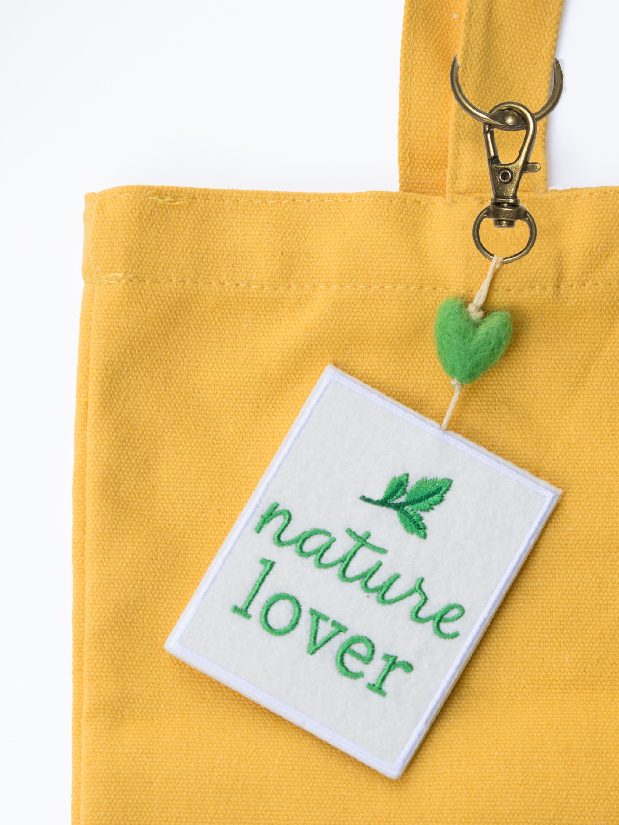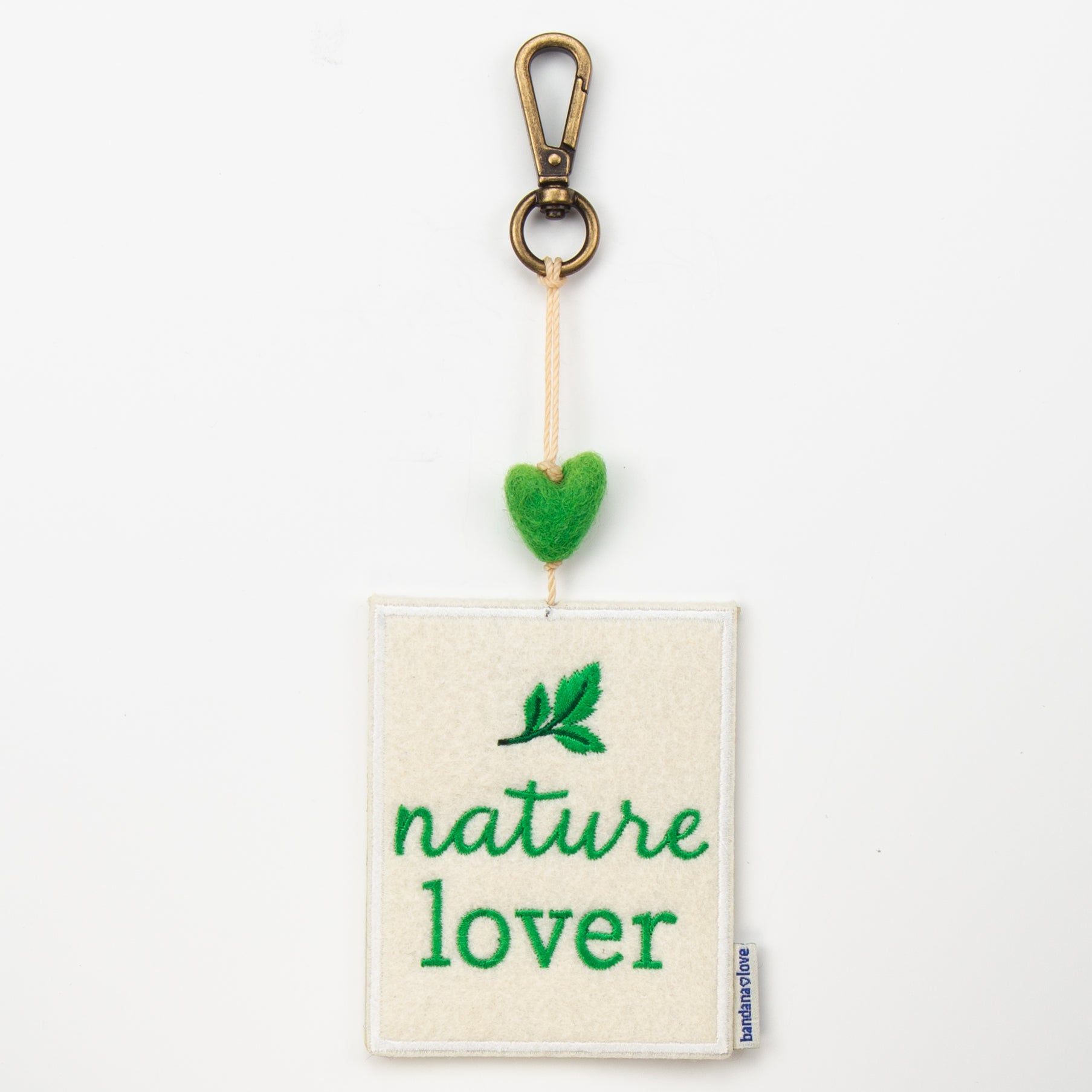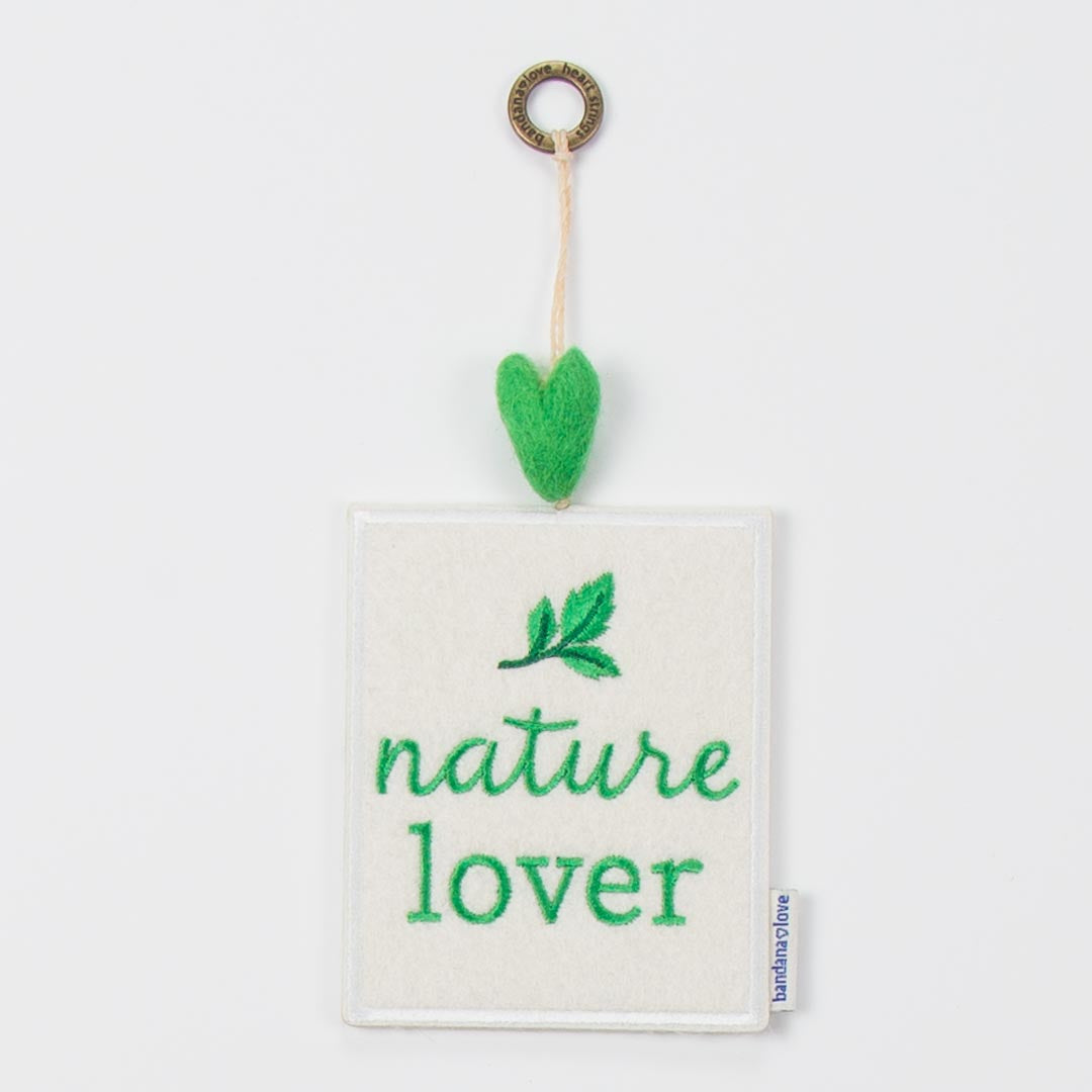 Our “Nature Lover” Mini Heart String is handmade with an ivory felt patch embroidered in green with the message “Nature Lover” and topped with a green felted wool heart.