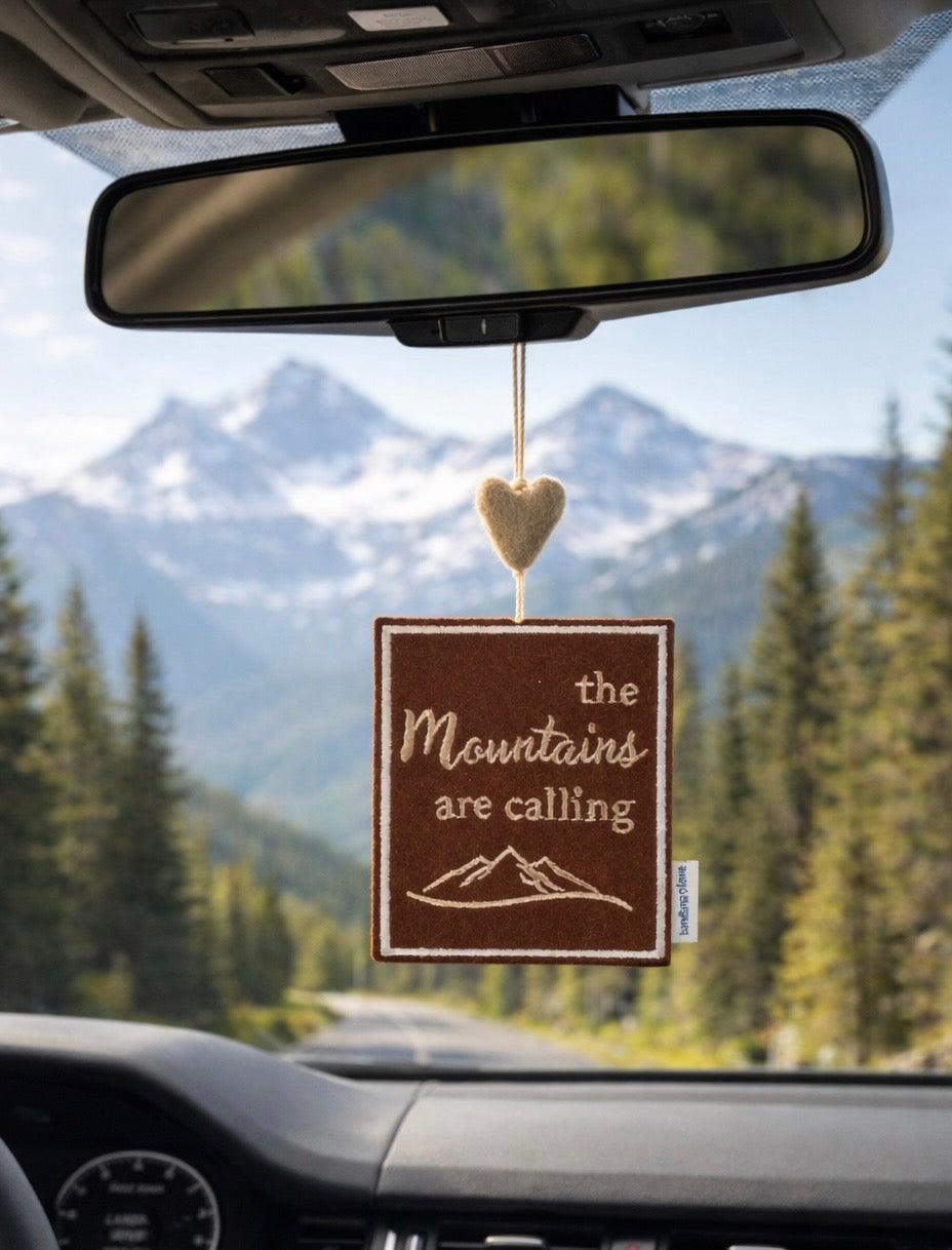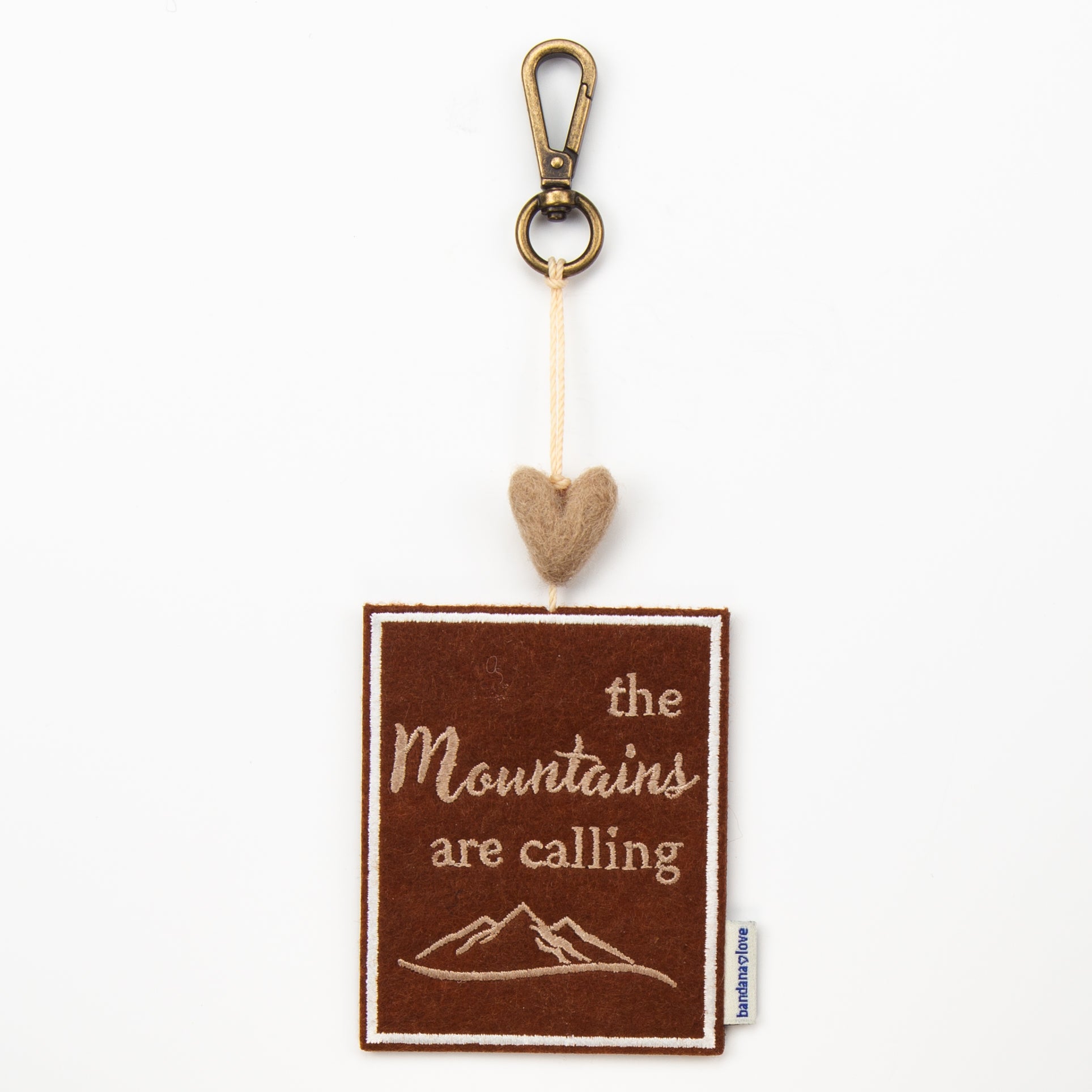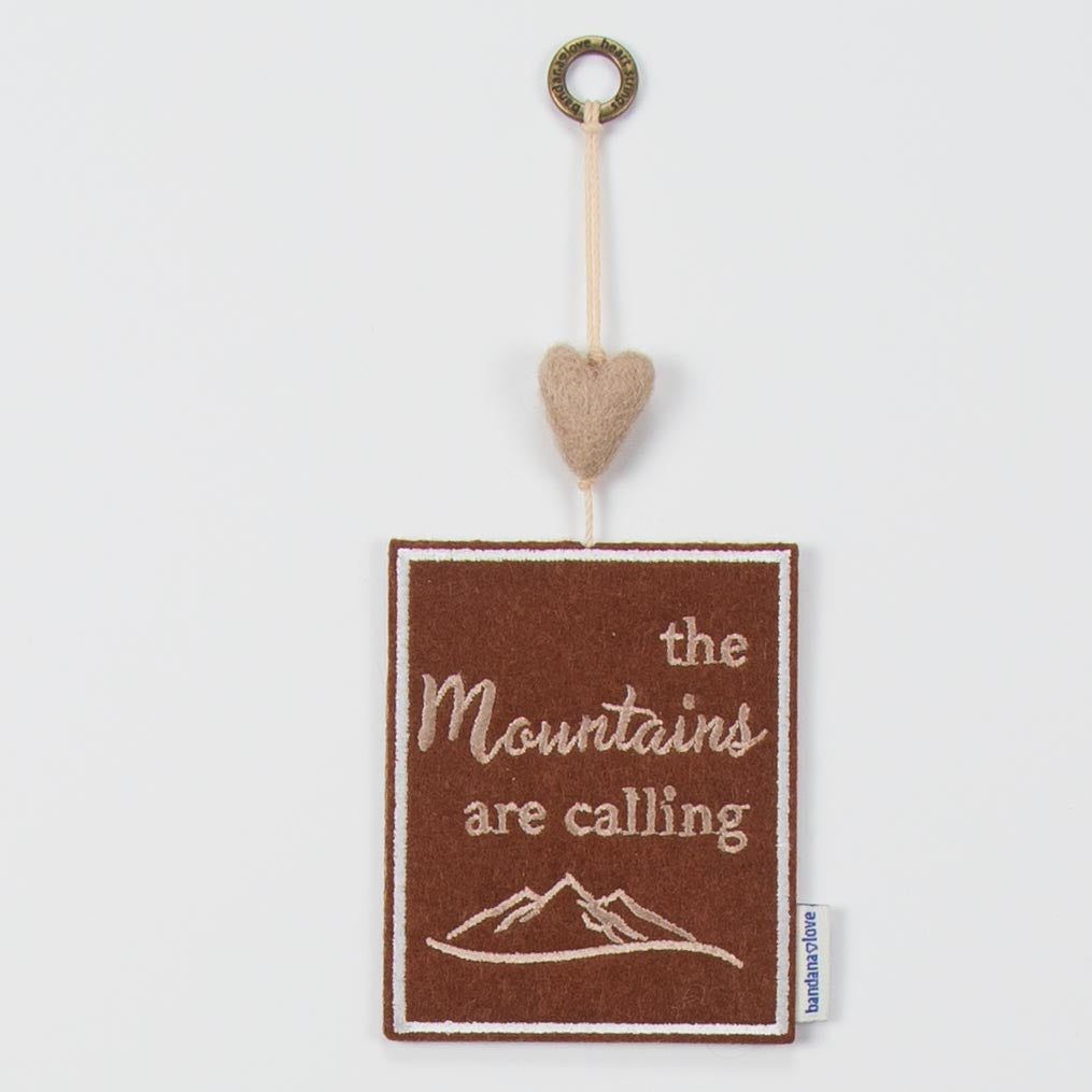 Our “The Mountains are Calling” Mini Heart String is handmade with a brown felt patch embroidered in taupe with the message “The Mountains are Calling” and topped with a taupe felted wool heart.