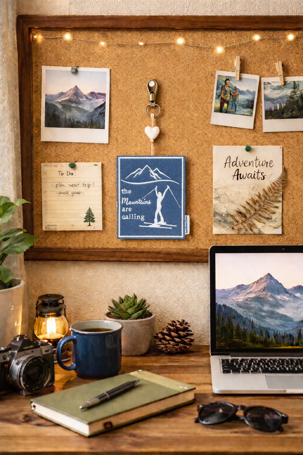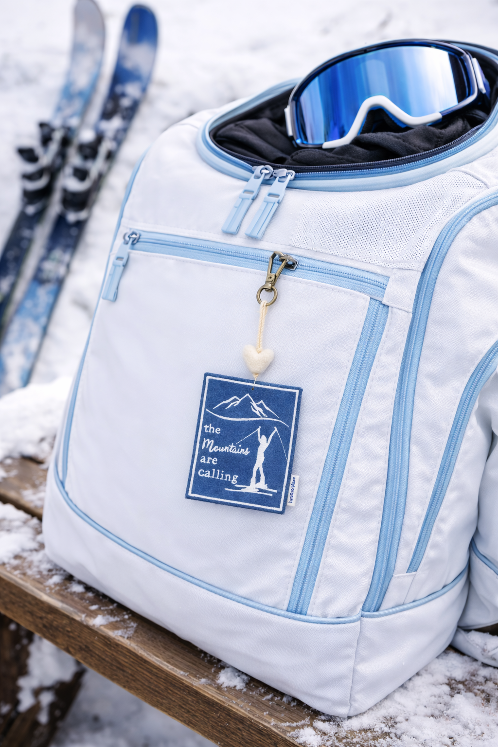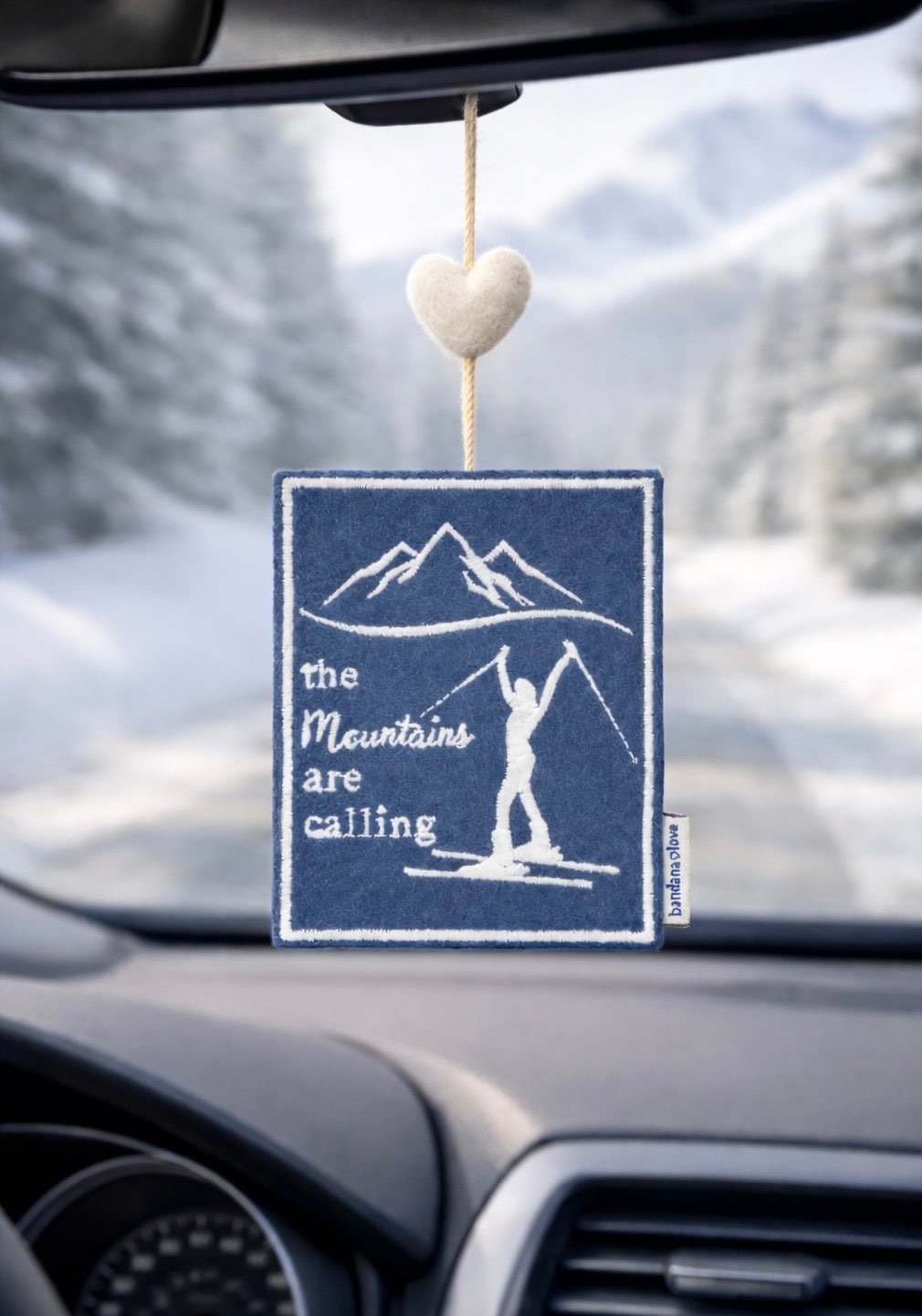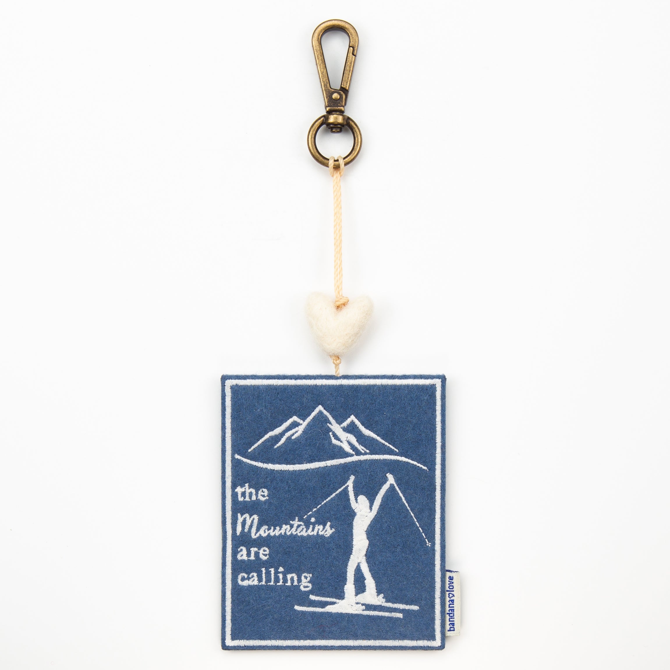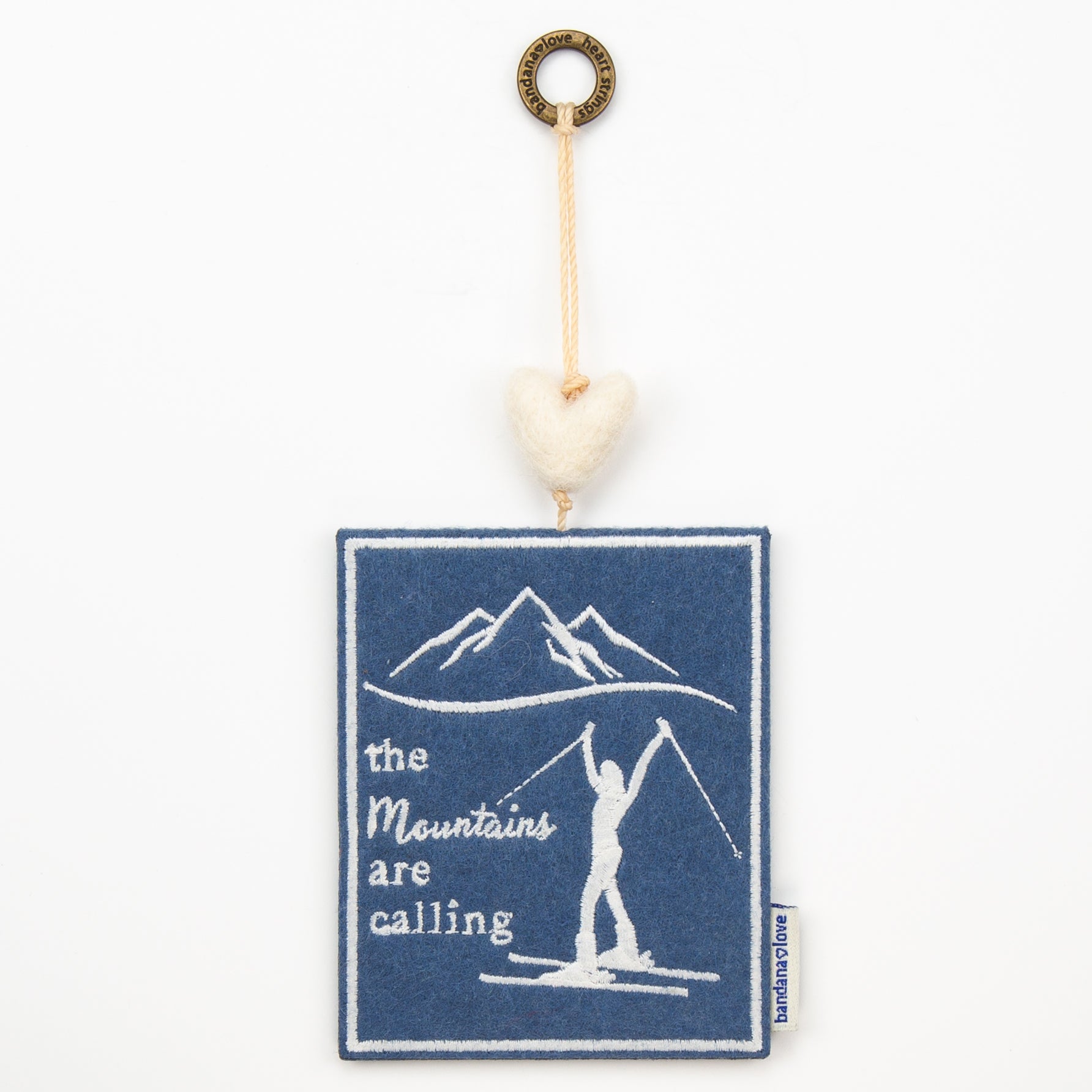 Our “The Mountains are Calling Skiing” Mini Heart String is handmade with a blue felt patch embroidered in ivory with the message “The Mountains are Calling” and topped with an ivory felted wool heart.