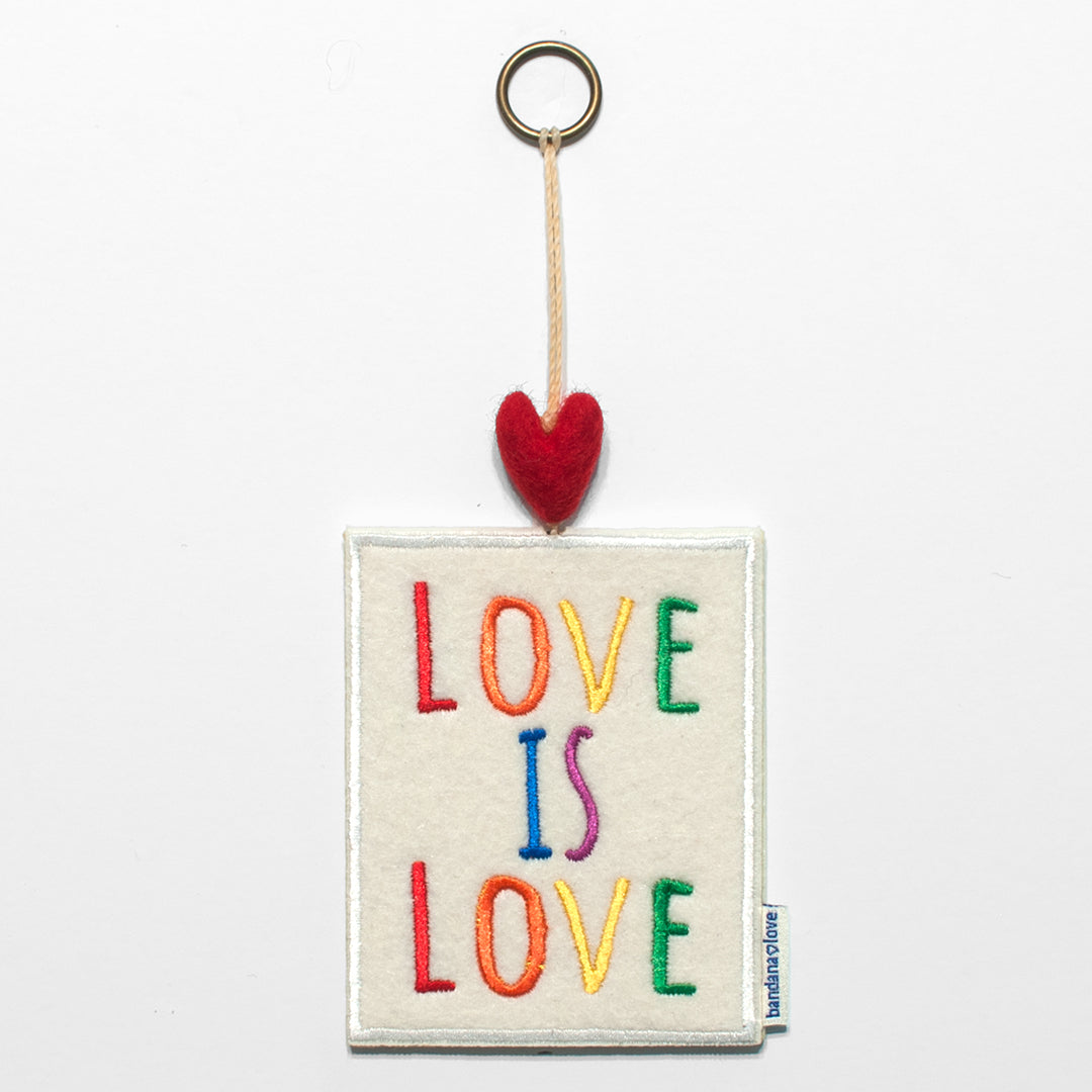 Ivory felt patch with the message “Love is Love” embroidered in the colors of the rainbow. Adorned with a red felted heart and finished with natural string and an antique brass ring for hanging.