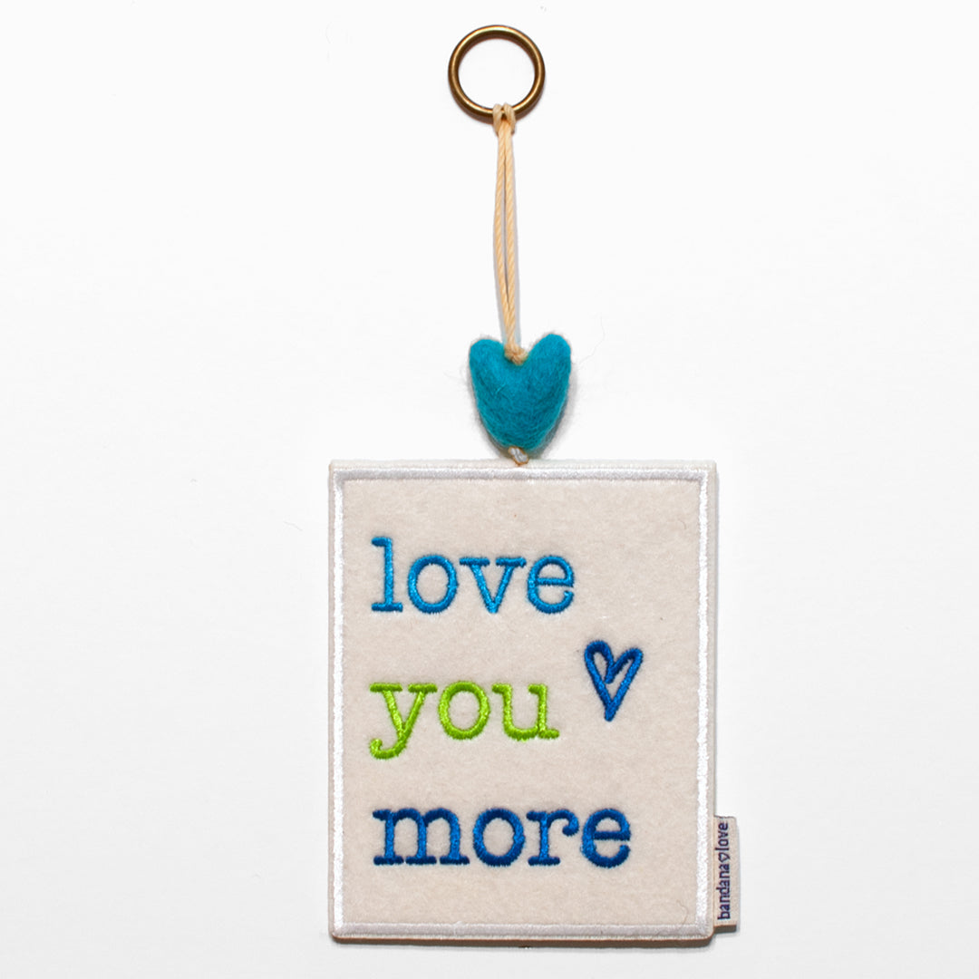 Ivory felt patch with the message “Love You More” embroidered in shades of blue or shades of pink with red. Adorned with a matching felted heart and finished with natural string and an antique brass ring for hanging.