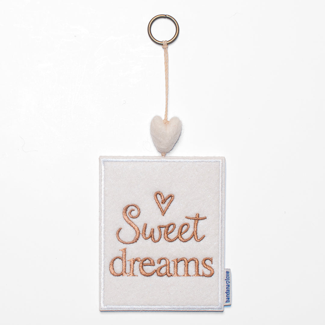 Ivory felt patch with the message “Sweet Dreams” embroidered in taupe. Adorned with an ivory felted heart and finished with natural string and an antique brass ring for hanging.