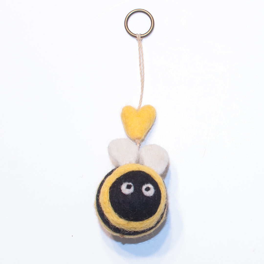 Our Bee Mini Heart String is handmade from yellow, ivory, and black felted wool with a yellow felted wool heart and finished with natural string and an antique brass ring for hanging.