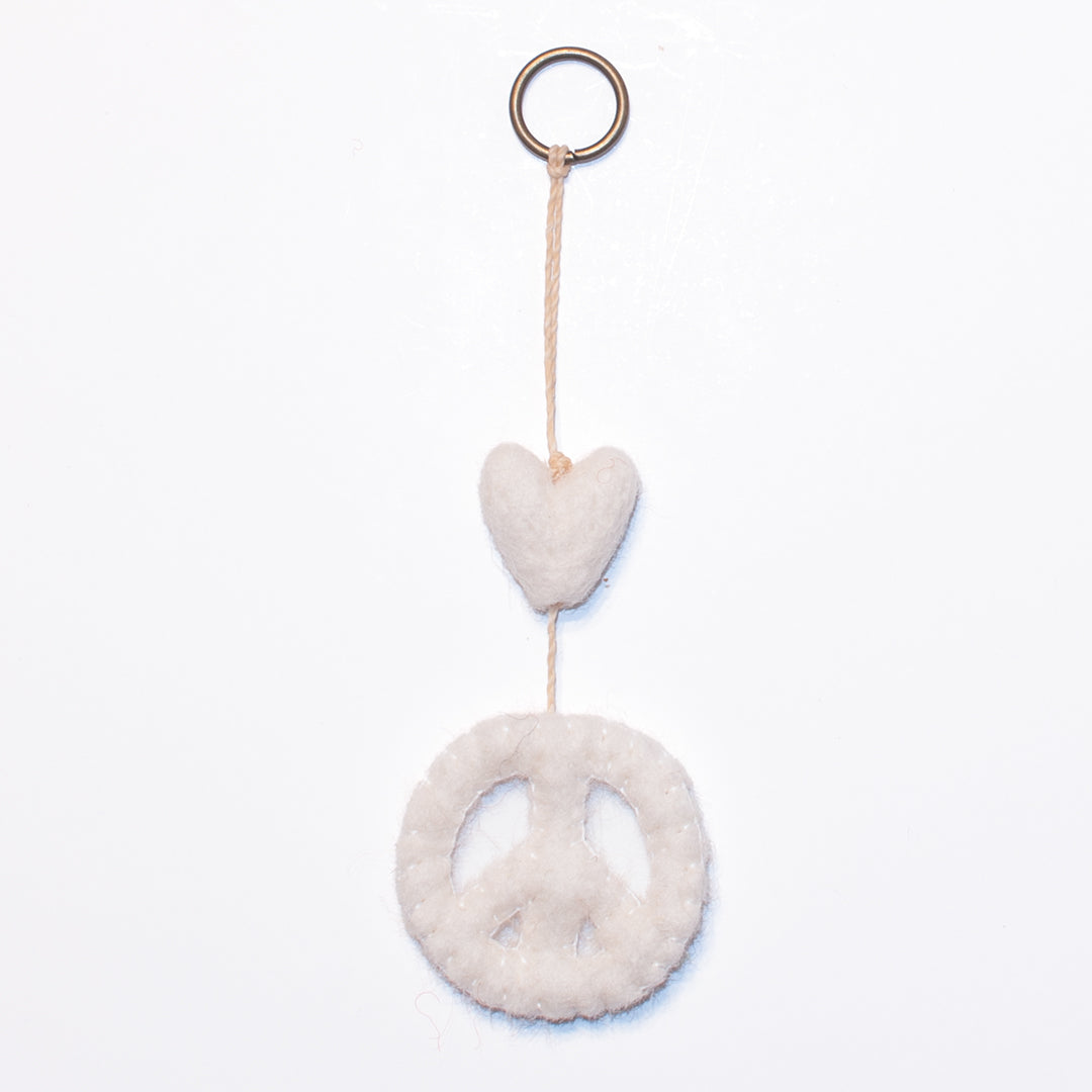 Our Ivory Peace Mini Heart String is handmade from ivory felted wool with an ivory felted wool heart and finished with natural string and an antique brass ring for hanging.
