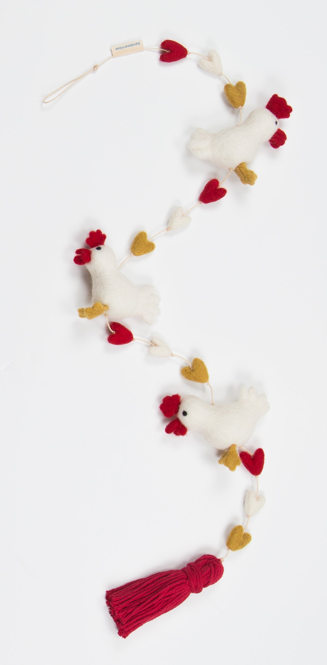 Our hand made wool felted “Chickens” Heart String is decorated with our red, gold, and ivory felted hearts, red, gold, and ivory felted chickens, and a red tassel. Approximately 32 inches long. Packaged in a red bandana cloth bag.