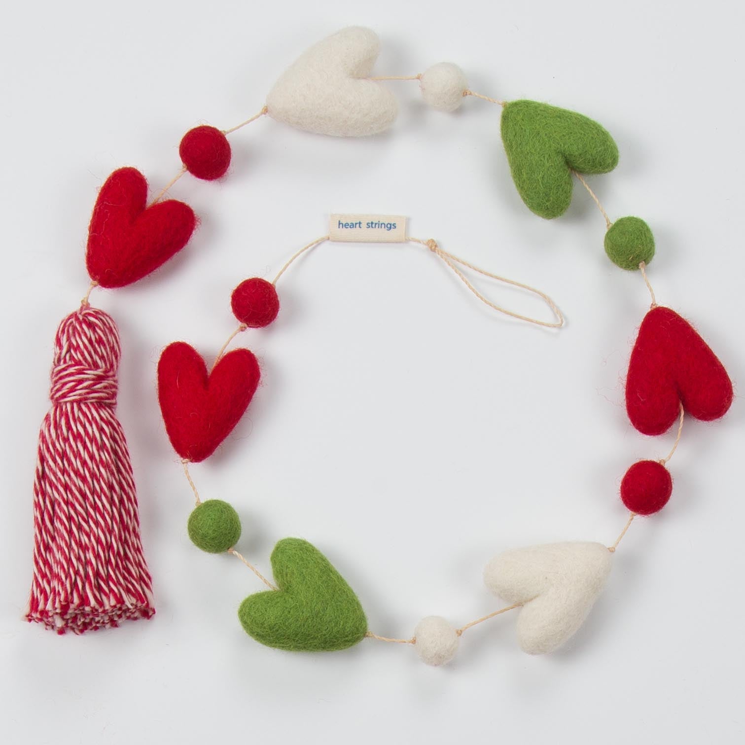 Our hand made wool felted “Christmas Hearts” Heart String is decorated with our red, green, and ivory felted large hearts, and red, green, and ivory felted balls, with a red and ivory tassel. Approximately 32 inches long. Packaged in a red bandana cloth bag.