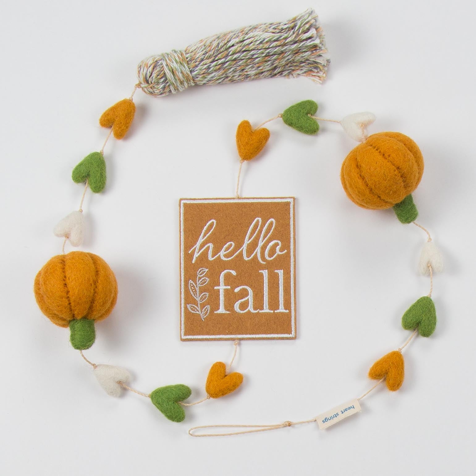 Our hand made wool felted “Hello Fall” Heart String is made with our green, orange, and ivory wool felted hearts and felted pumpkins. Decorated with an embroidered felt "Hello Fall” patch at the center and finished with a green, orange and ivory tassel at the end. Approximately 34 inches long. Packaged in an orange bandana cloth bag.