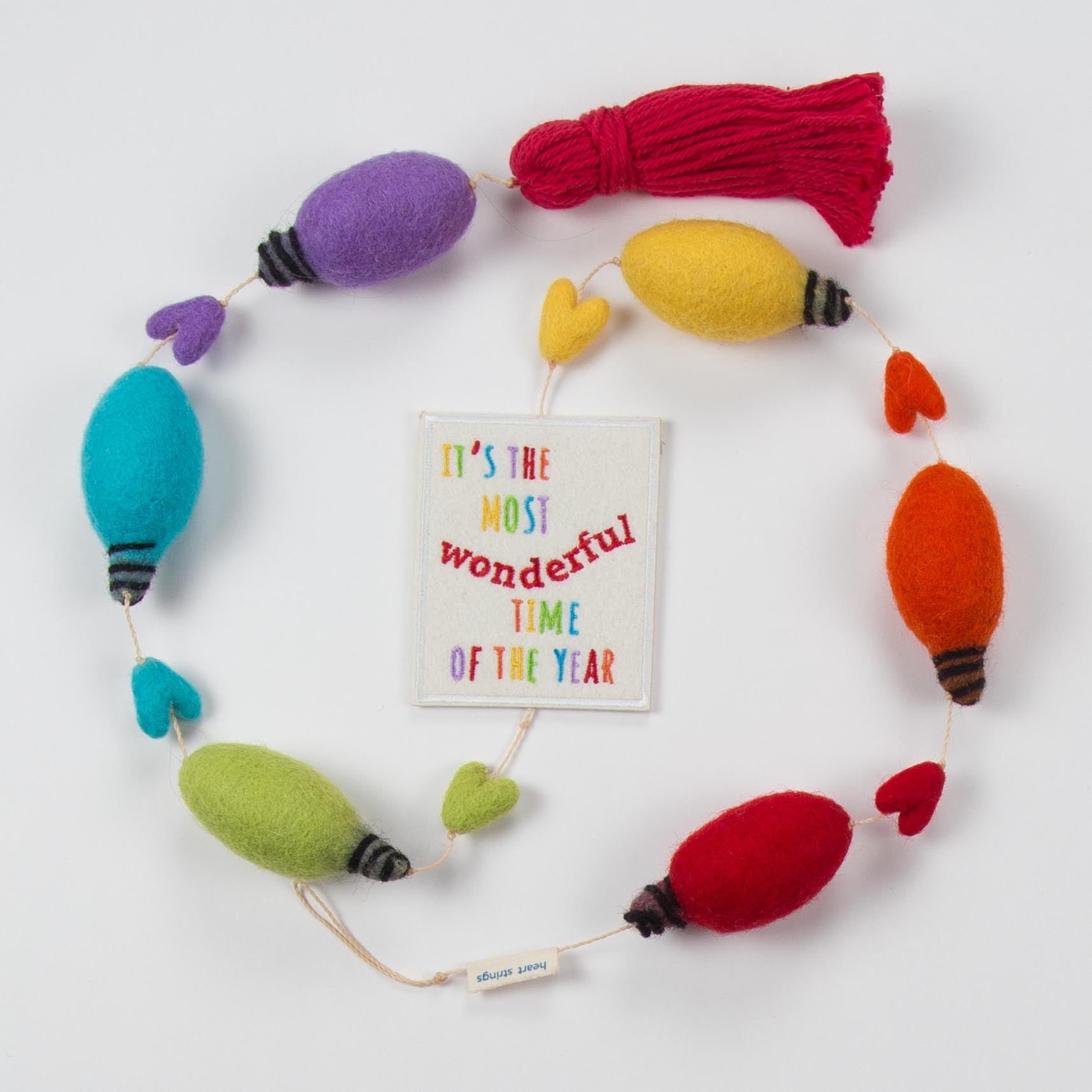 Our hand made wool felted “It’s the Most Wonderful Time of the Year” Heart String is made with our wool felted hearts and holiday lights in the color of the rainbow. Decorated with an embroidered felt "It’s the Most Wonderful Time of the Year” patch at the center and finished with a red tassel at the end. Approximately 39 inches long. Packaged in a red bandana cloth bag.