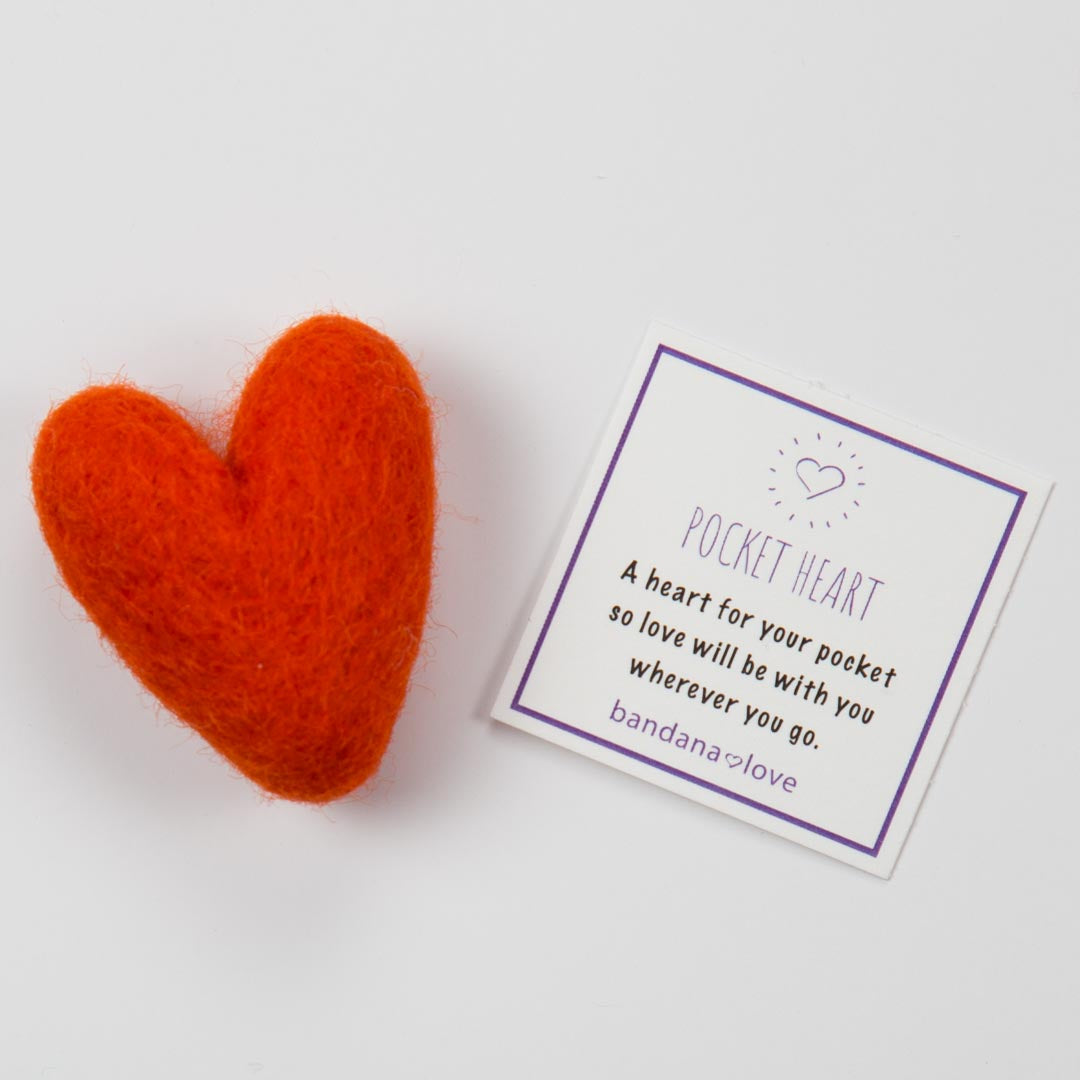 A handmade 2 inch orange wool felted heart for the pocket. Give them as a gift to show someone they are loved. Packaged in a small case with the message, “A heart for your pocket, so love will be with you wherever you go”.