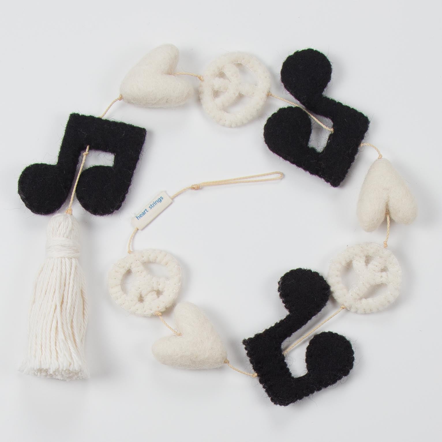 Our hand made wool felted “Peace Love Music” Heart String is decorated with our ivory felted hearts, ivory felted peace signs, and black felted music notes. Finished with an ivory tassel. Approximately 32 inches long. Packaged in an ivory and black bandana cloth bag.