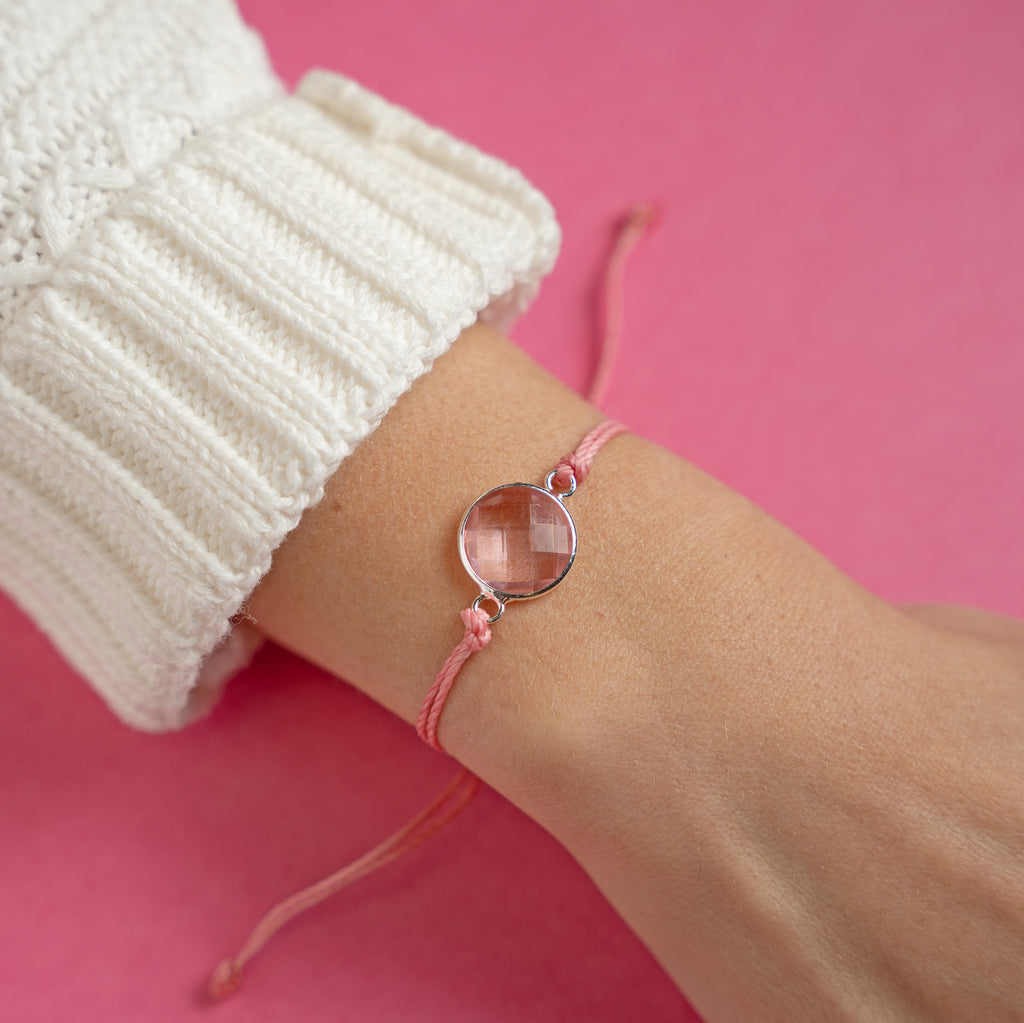 * 1mm pink waterproof waxed Brazilian polyester cord with a pink glass medallion at center