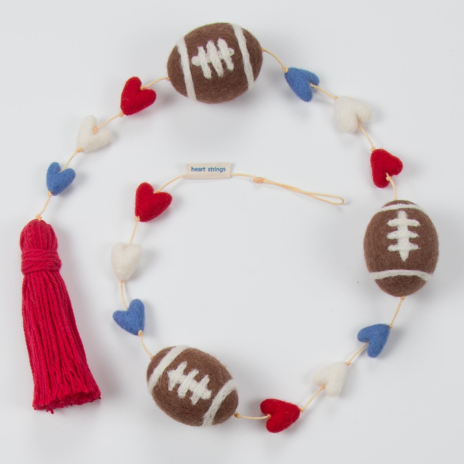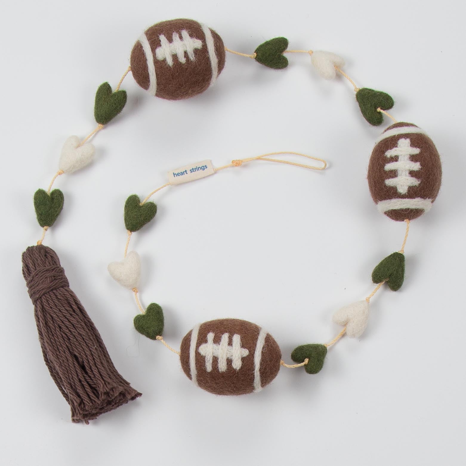 Our hand made wool felted “Football” Heart String is made with our green, brown and ivory felted hearts and felted footballs, with a brown tassel at the end. Approximately 32 inches long. Packaged in a green bandana cloth bag.