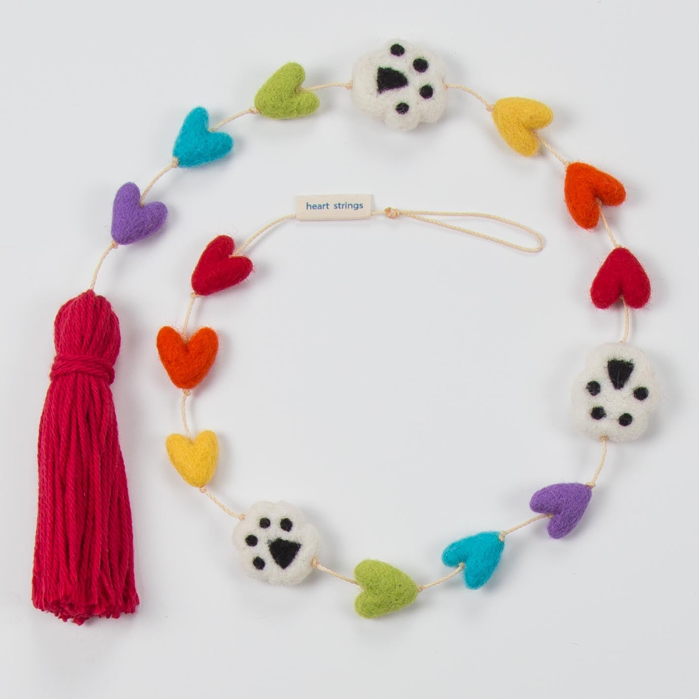 Our hand made wool felted “Rainbow Paw Prints” Heart String is decorated with our felted hearts in the colors of the rainbow, felted paw prints, and a red tassel. Approximately 32 inches long. Packaged in a red bandana cloth bag.