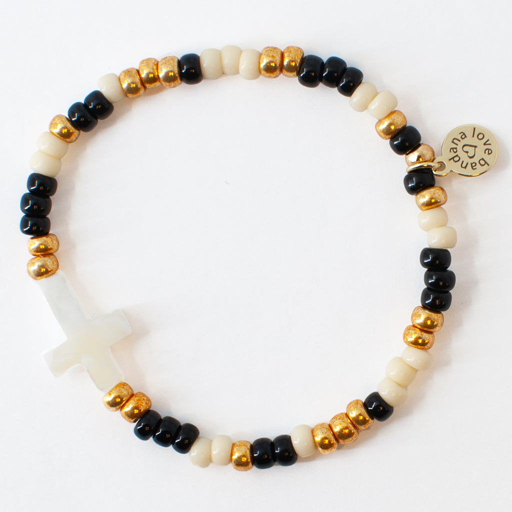 * 4mm black, ivory, and gold Japanese Miyuki glass beads with a shell, ivory cross at center