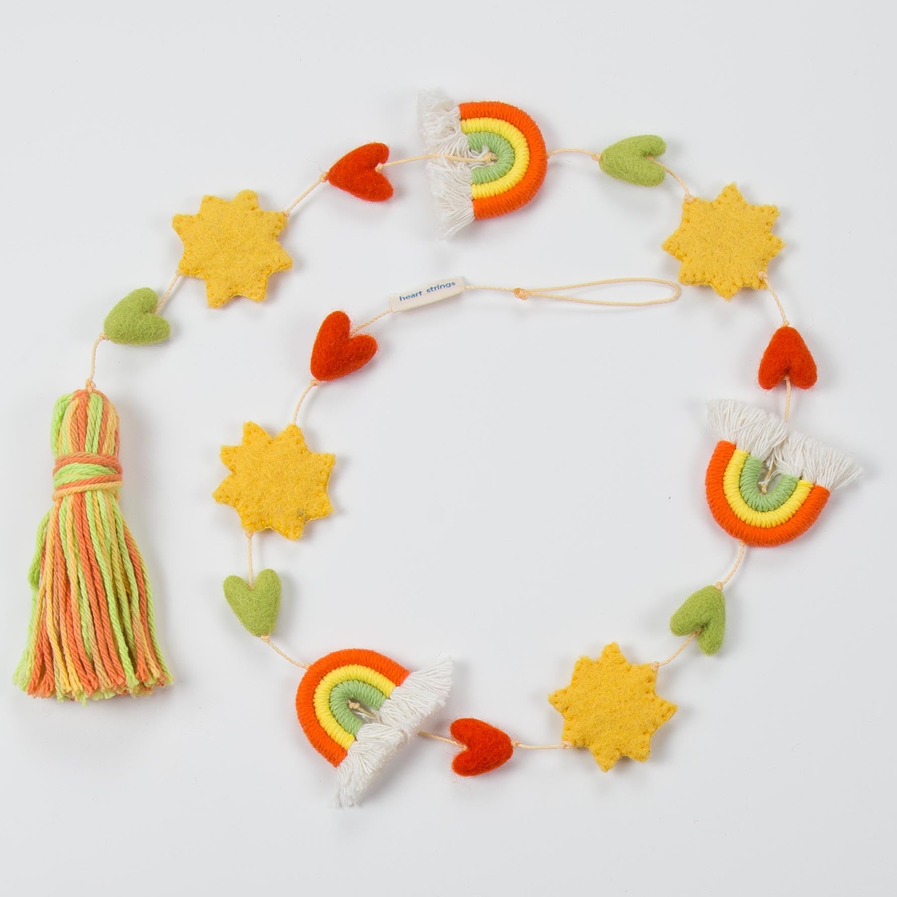 Our hand made wool felted “Sunshine and Rainbows” Heart String is decorated with our orange and green felted hearts, yellow felted suns, orange rope rainbows, and an orange, yellow and green tassel. Approximately 33 inches long. Packaged in an orange bandana cloth bag.