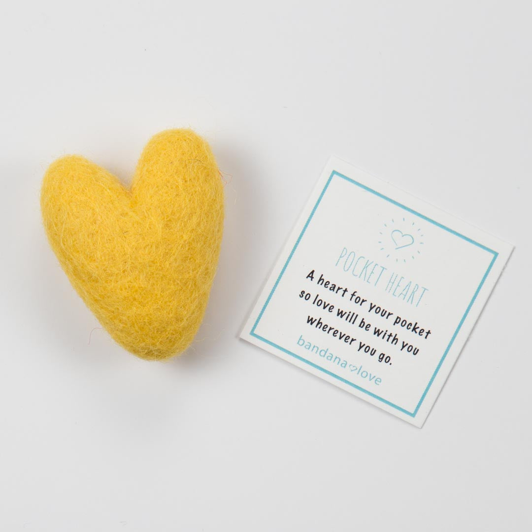 A handmade 2 inch yellow wool felted heart for the pocket. Give them as a gift to show someone they are loved. Packaged in a small case with the message, “A heart for your pocket, so love will be with you wherever you go”.